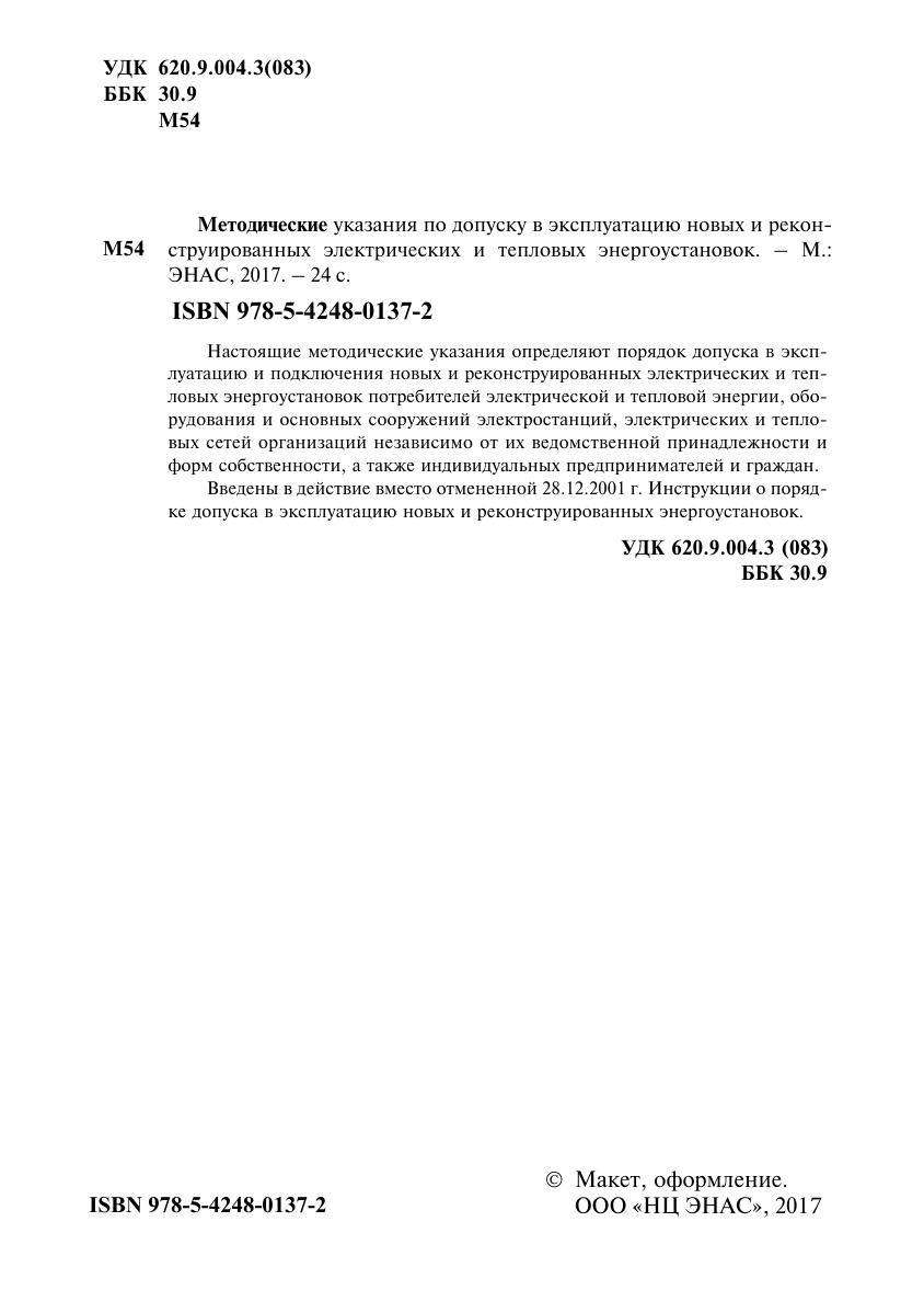 Настоящие методические указания определяют порядок допуска в эксплуатацию и подключения новых и реконструированных электрических и тепловых энергоустановок потребителей электрической и тепловой энергии, оборудования и основных сооружений электростанций, электрических и тепловых сетей организаций независимо от их ведомственной принадлежности и форм собственности, а также индивидуальных предпринимателей и граждан. Введены в действие вместо отмененной 28.12.2001 г. Инструкции о порядке допуска в эксплуатацию новых и реконструированных энергоустановок.