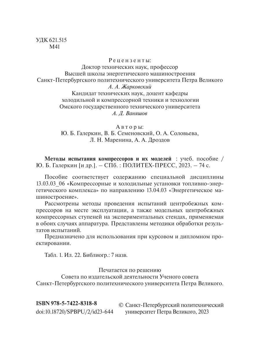 Пособие соответствует содержанию специальной дисциплины 13.03.03_06 «Компрессорные и холодильные установки топливно-энергетического комплекса» по направлению 13.04.03 «Энергетическое машиностроение». Рассмотрены методы проведения испытаний центробежных компрессоров на месте эксплуатации, а также модельных центробежных компрессорных ступеней на экспериментальных стендах, применяемая в обоих случаях аппаратура. Представлены методики обработки результатов испытаний. Предназначено для использования при курсовом и дипломном проектировании.