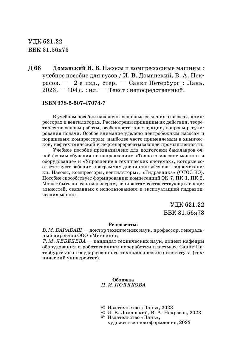 В учебном пособии изложены основные сведения о насосах, компрессорах и вентиляторах. Рассмотрены принципы их действия, теоретические основы работы, особенности конструкции, вопросы регулирования подачи. Особое внимание уделено центробежным насосам и поршневым компрессорам, наиболее часто применяемым в химической, нефтехимической и нефтеперерабатывающей промышленности. Учебное пособие предназначено для подготовки бакалавров очной формы обучения по направлениям «Технологические машины и оборудование» и «Управление в технических системах», которые соответствуют рабочим программам дисциплин «Основы гидромеханики. Насосы, компрессоры, вентиляторы», «Гидравлика» (ФГОС ВО). Пособие способствует формированию компетенций ОК-7, ПК-1, ПК-2. Может быть полезно магистрам, аспирантам соответствующих специальностей, связанных с использованием и эксплуатацией гидравлических машин.