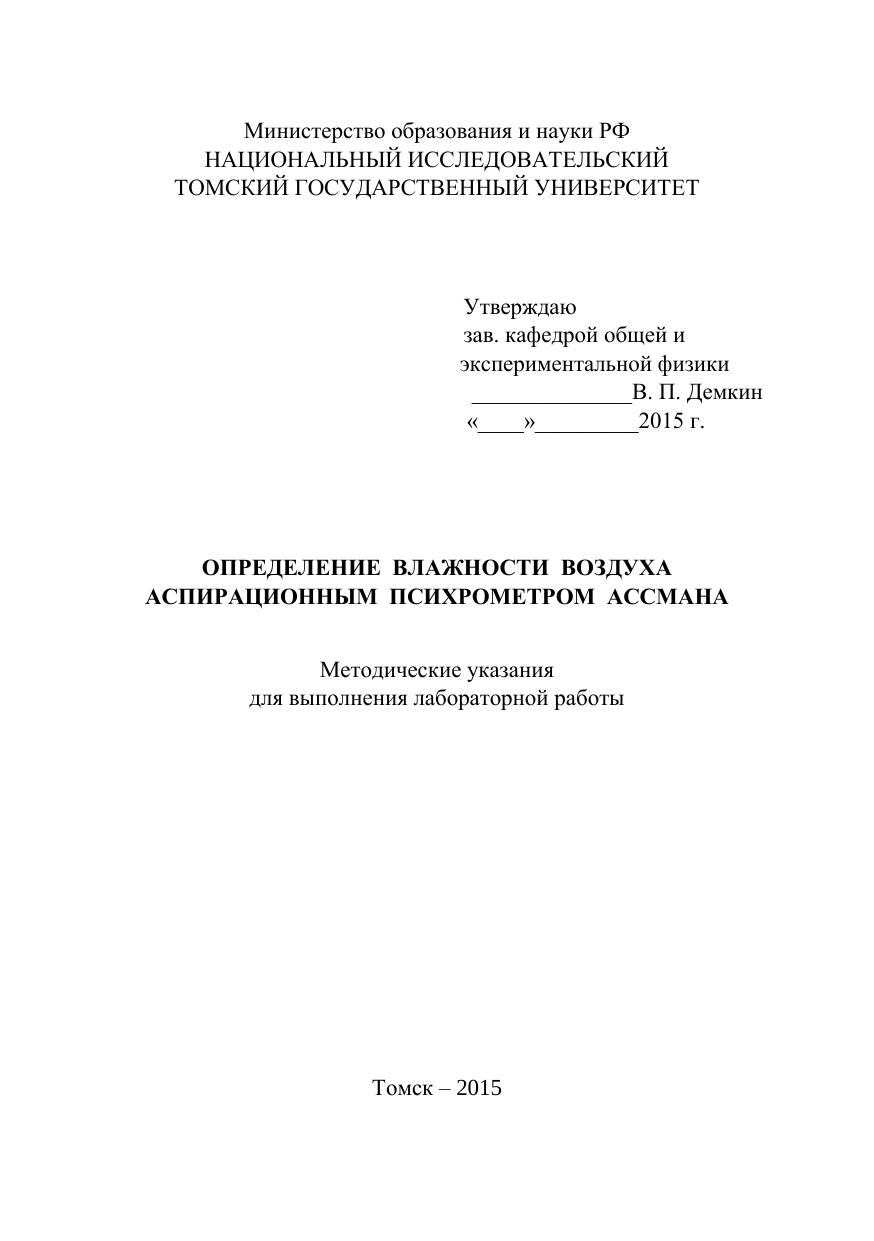 Определение влажности воздуха аспирационным психрометром ассмана. Методические указания для выполнения лабораторной работы