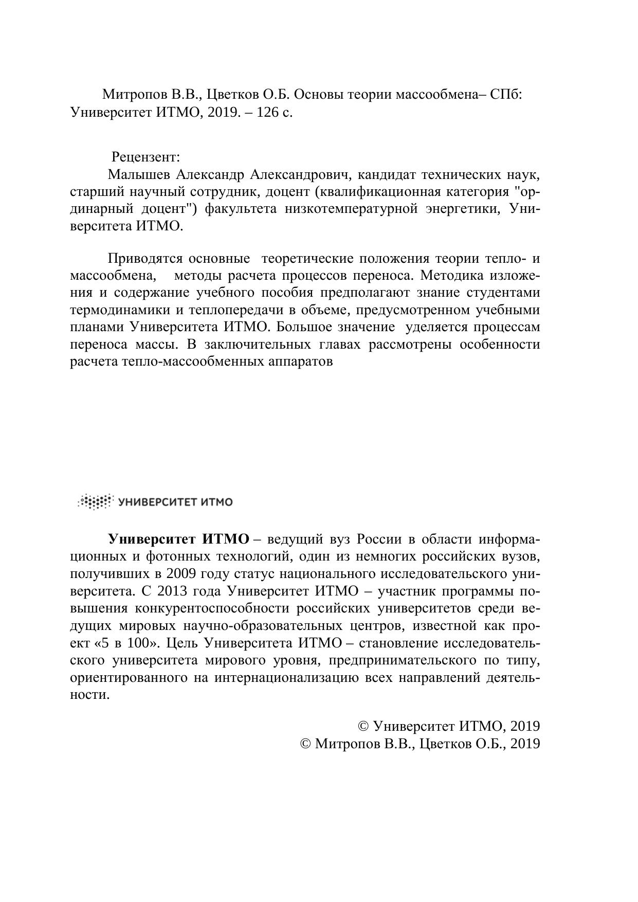 Приводятся основные теоретические положения теории тепло- и массообмена, методы расчета процессов переноса. Методика изложения и содержание учебного пособия предполагают знание студентами термодинамики и теплопередачи в объеме, предусмотренном учебными Планами Университета ИТМО. Большое значение уделяется процессам переноса массы. В заключительных главах рассмотрены особенности расчета тепло-массообменных аппаратов.