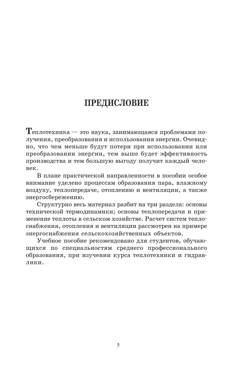 Учебное пособие по теплотехнике состоит из трех разделов: основы технической термодинамики, основы теплопередачи, применение теплоты в сельском хозяйстве. В них изложены основные положения технической термодинамики, теории тепломассообмена, освещены вопросы топлива и его горения, котельных установок, отопления, вентиляции. Соответствует современным требованиям Федерального государственного образовательного стандарта среднего профессионального образования и профессиональным квалификационным требованиям. Учебное пособие рекомендовано студентам, обучающимся по специальностям среднего профессионального образования, при изучении курса теплотехники и гидравлики.