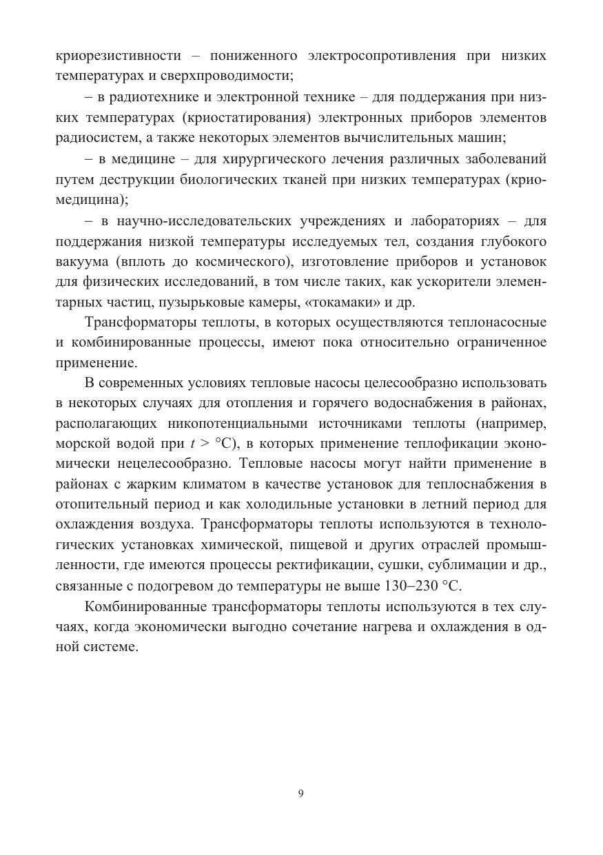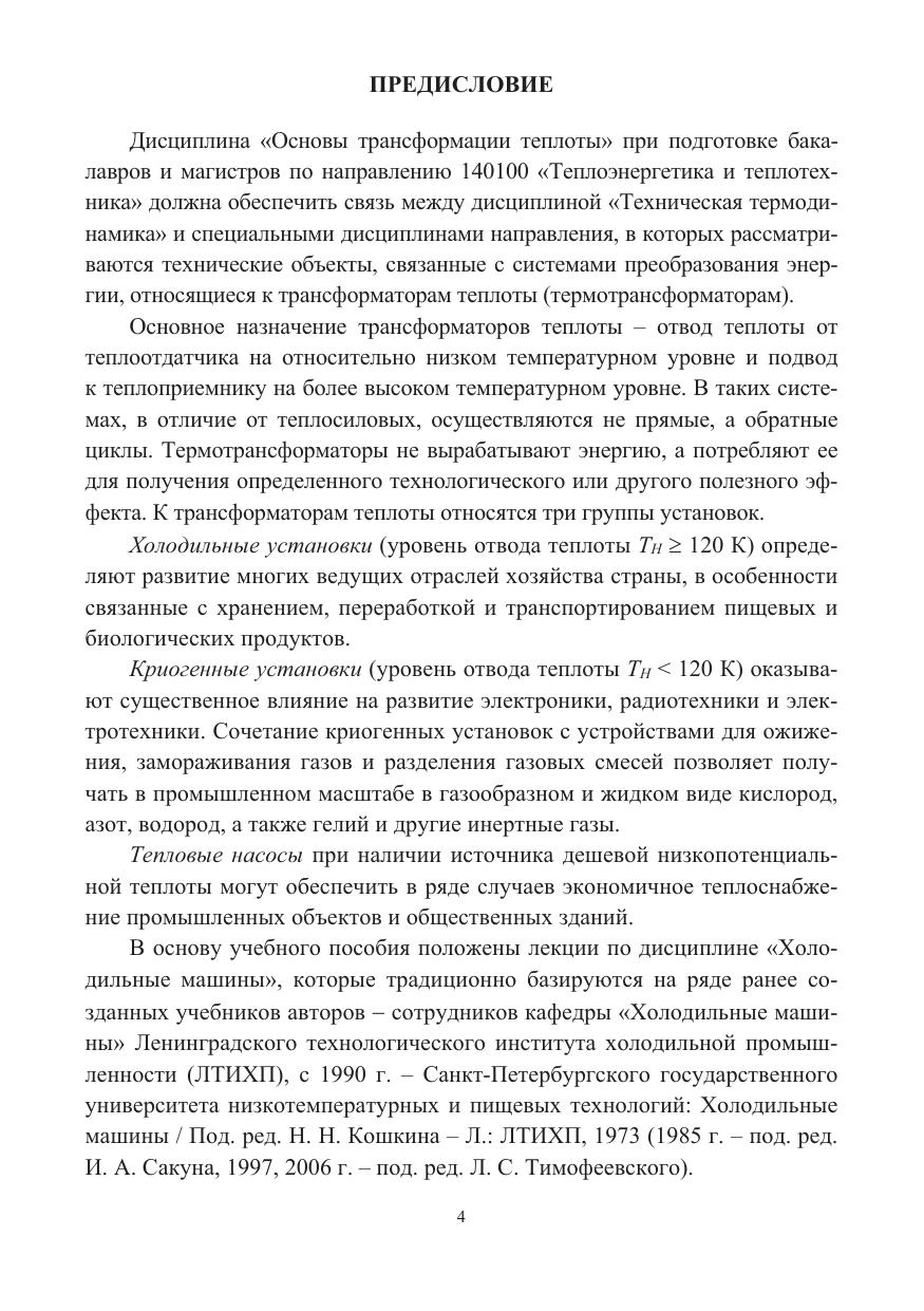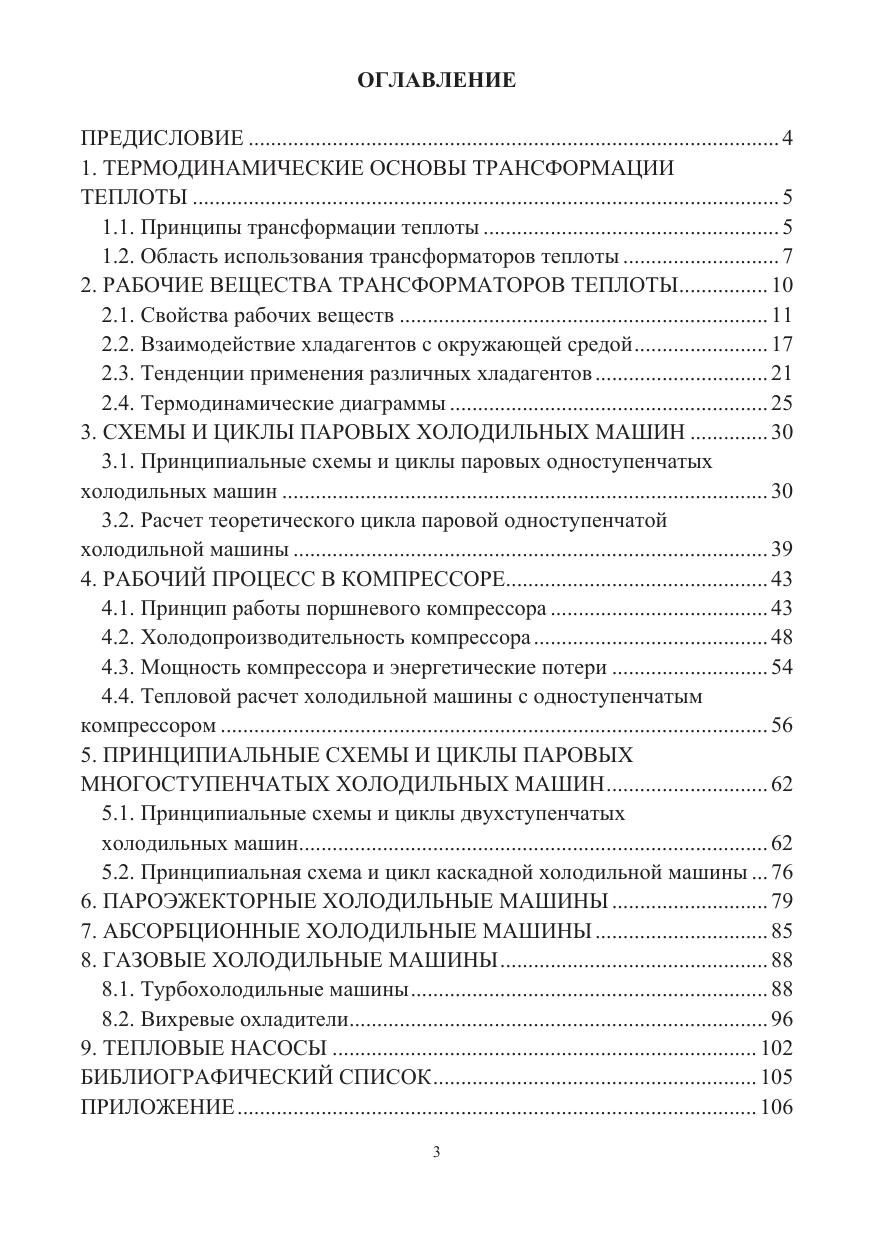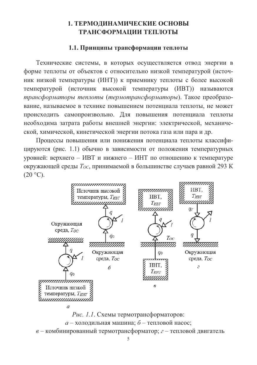 Рассмотрены термодинамические основы трансформации теплоты, рабочие вещества трансформаторов теплоты, рабочие процессы в компрессоре. Приведены схемы и циклы паровых, пароэжекторных, абсорбционных, газовых холодильных машин и тепловых насосов. Даны примеры расчета холодильных машин и их элементов.