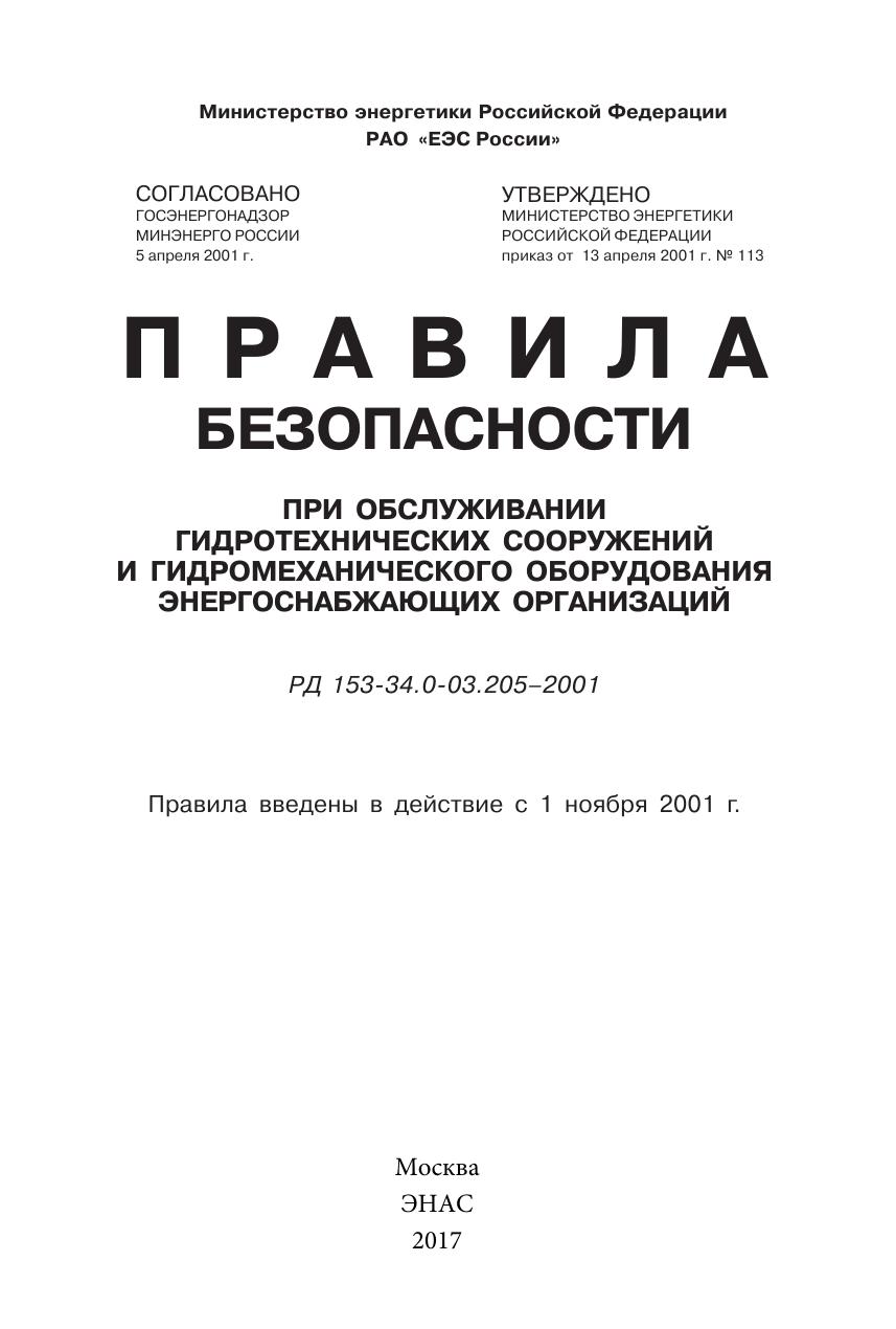 Правила безопасности при обслуживании гидротехнических сооружений и гидромеханического оборудования энергоснабжающих организаций. РД 153-34.0-03.205–2001