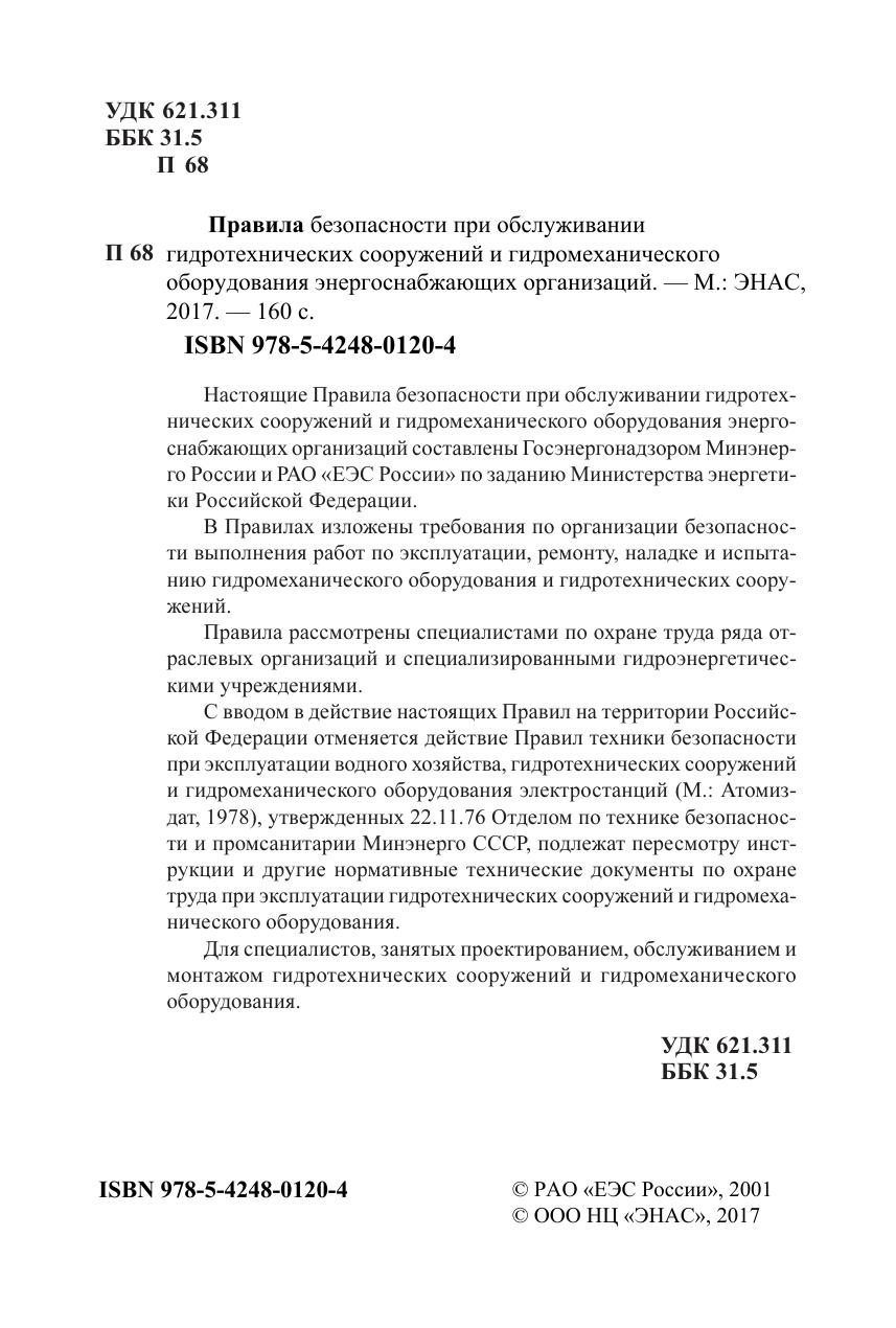 С вводом в действие настоящих Правил на территории Российской Федерации отменяется действие Правил техники безопасности при эксплуатации водного хозяйства, гидротехнических сооружений и гидромеханического оборудования электростанций (М.: Атомиз-дат, 1978), утвержденных 22.11.76 Отделом по технике безопасности и промсанитарии Минэнерго СССР, подлежат пересмотру инструкции и другие нормативные технические документы по охране труда при эксплуатации гидротехнических сооружений и гидромеханического оборудования. Для специалистов, занятых проектированием, обслуживанием и монтажом гидротехнических сооружений и гидромеханического оборудования.