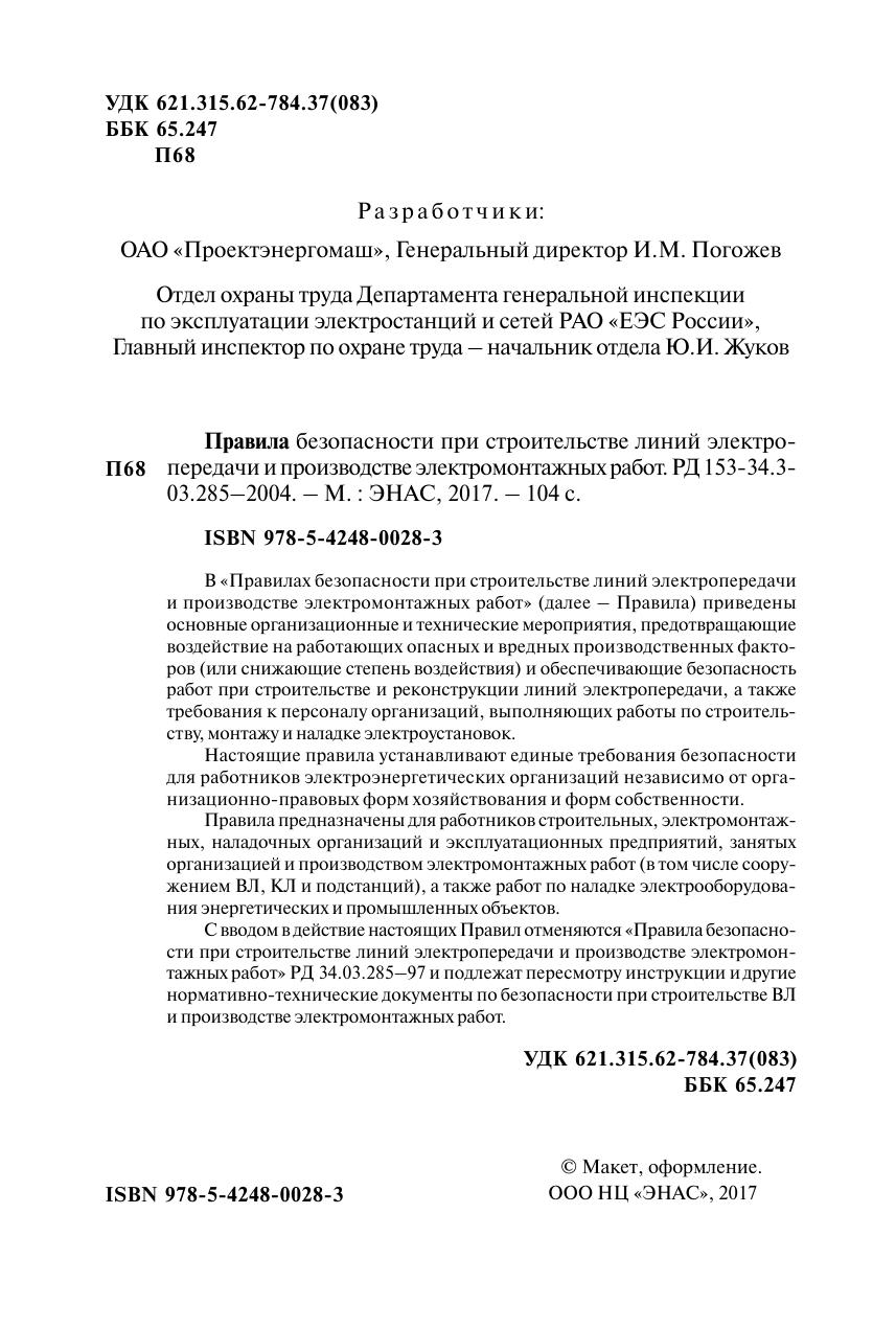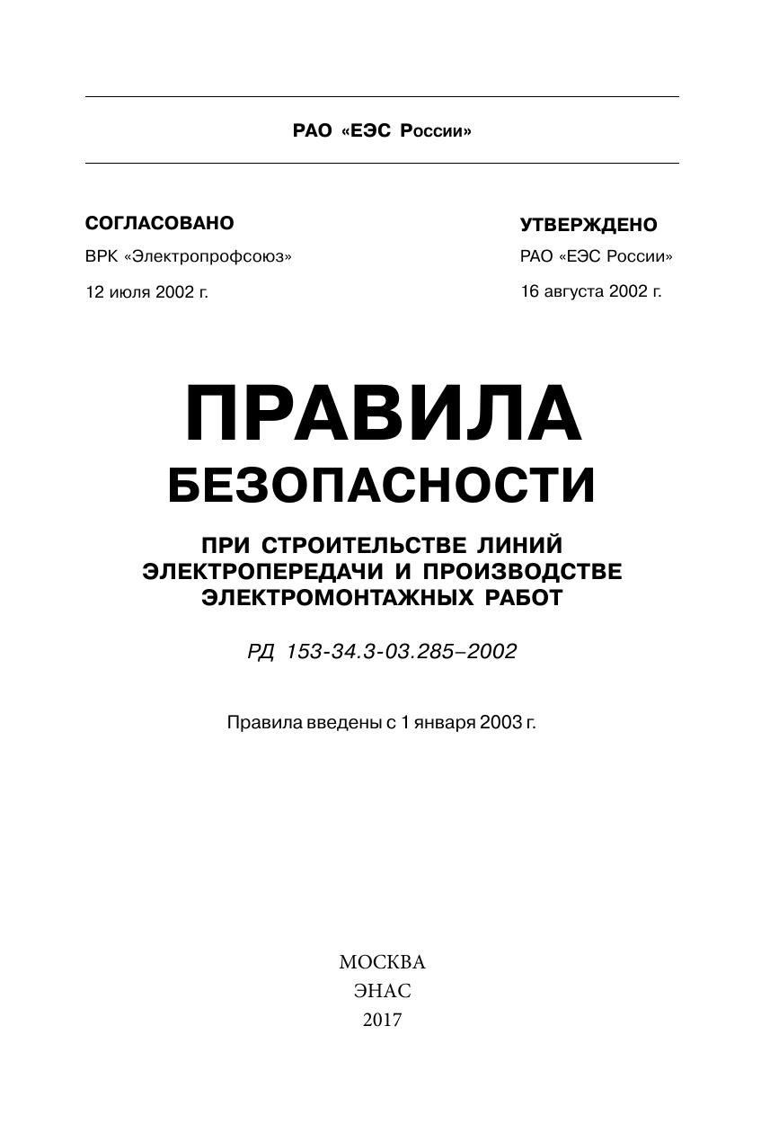 Правила безопасности при строительстве линий электропередачи и производстве электромонтажных работ. РД 153-34.3-03.285–2004