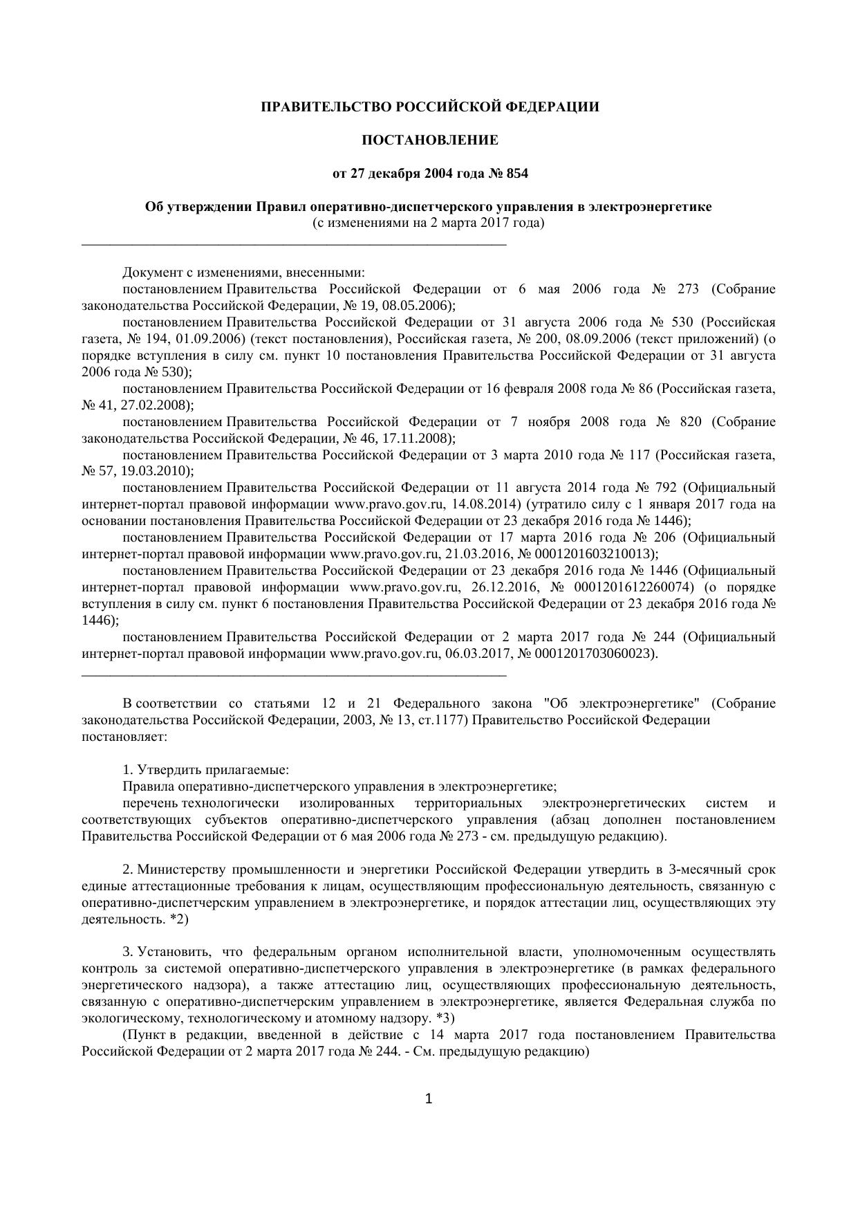 Правила оперативно-диспетчерского управления в электроэнергетике (с изменениями на 2 марта 2017 года)