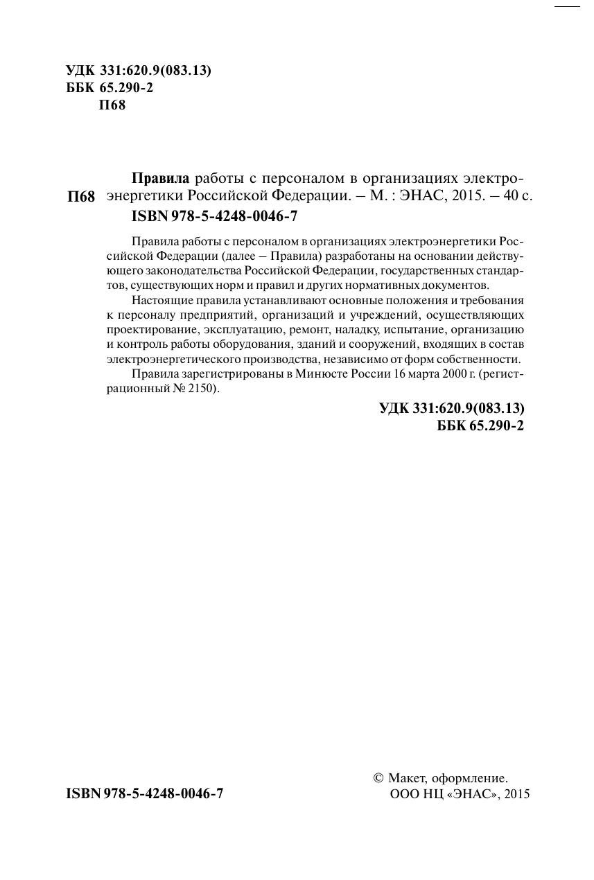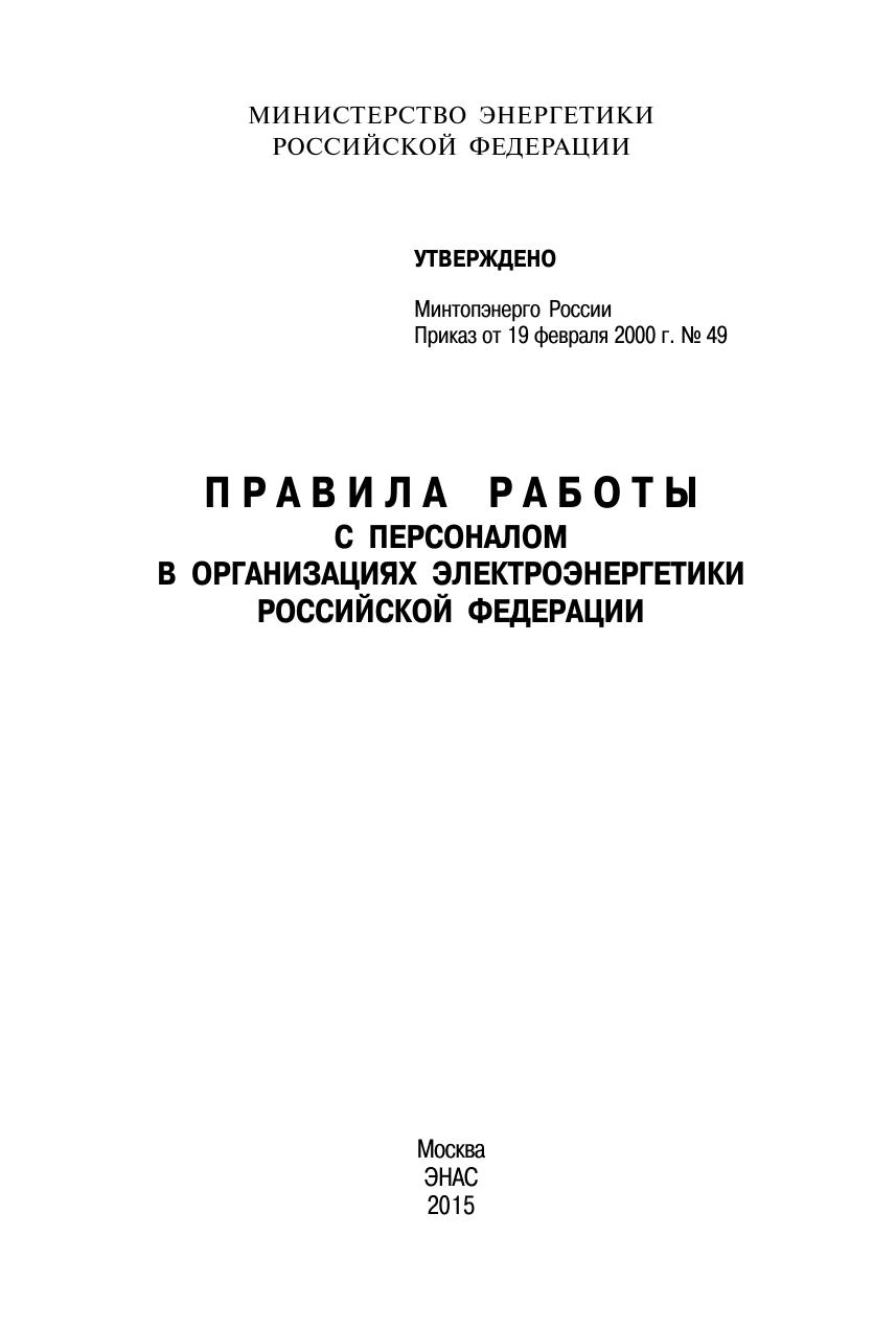 Правила работы с персоналом в организациях электроэнергетики Российской Федерации (далее – Правила) разработаны на основании действующего законодательства Российской Федерации, государственных стандартов, существующих норм и правил и других нормативных документов. Настоящие правила устанавливают основные положения и требования к персоналу предприятий, организаций и учреждений, осуществляющих проектирование, эксплуатацию, ремонт, наладку, испытание, организацию и контроль работы оборудования, зданий и сооружений, входящих в состав электроэнергетического производства, независимо от форм собственности. Правила зарегистрированы в Минюсте России 16 марта 2000 г. (регистрационный № 2150).