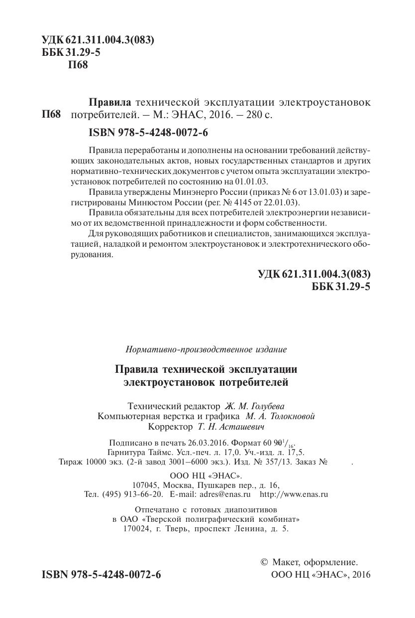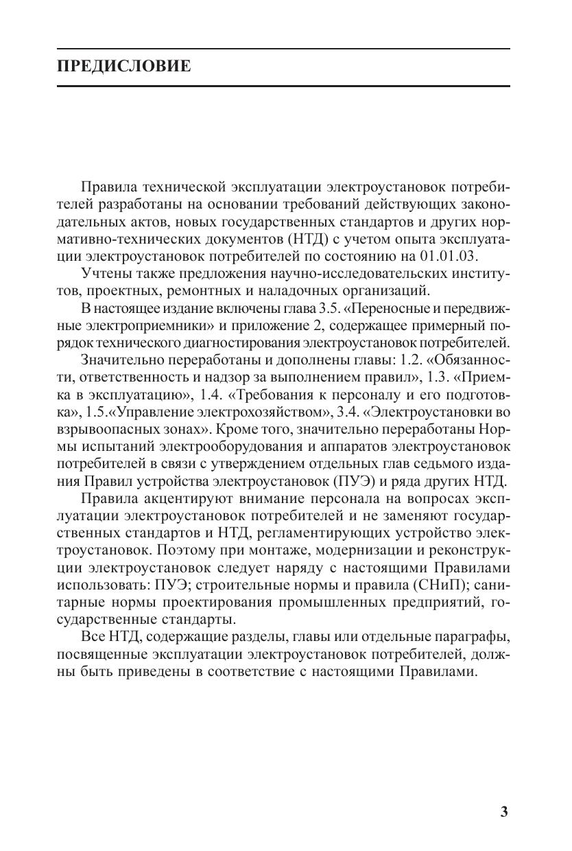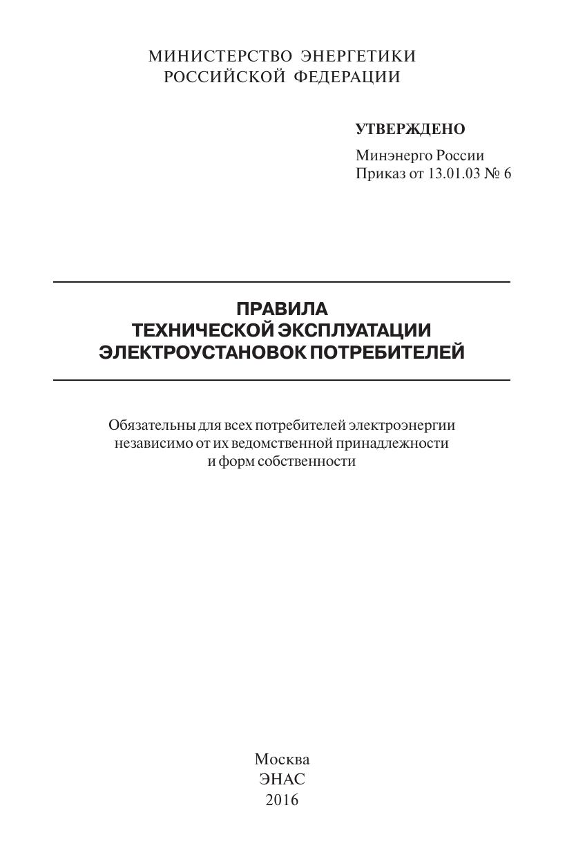 Правила переработаны и дополнены на основании требований действующих законодательных актов, новых государственных стандартов и других нормативно;технических документов с учетом опыта эксплуатации электроустановок потребителей по состоянию на 01.01.03. Правила утверждены Минэнерго России (приказ № 6 от 13.01.03) и зарегистрированы Минюстом России (рег. № 4145 от 22.01.03). Правила обязательны для всех потребителей электроэнергии независимо от их ведомственной принадлежности и форм собственности. Для руководящих работников и специалистов, занимающихся эксплуатацией, наладкой и ремонтом электроустановок и электротехнического оборудования.