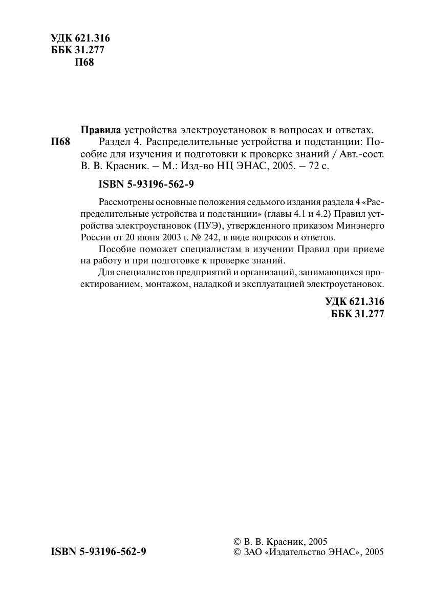 Рассмотрены основные положения седьмого издания раздела 4 «Распределительные устройства и подстанции» (главы 4.1 и 4.2) Правил устройства электроустановок (ПУЭ), утвержденного приказом Минэнерго России от 20 июня 2003 г. № 242, в виде вопросов и ответов. Пособие поможет специалистам в изучении Правил при приеме на работу и при подготовке к проверке знаний. Для специалистов предприятий и организаций, занимающихся проектированием, монтажом, наладкой и эксплуатацией электроустановок.