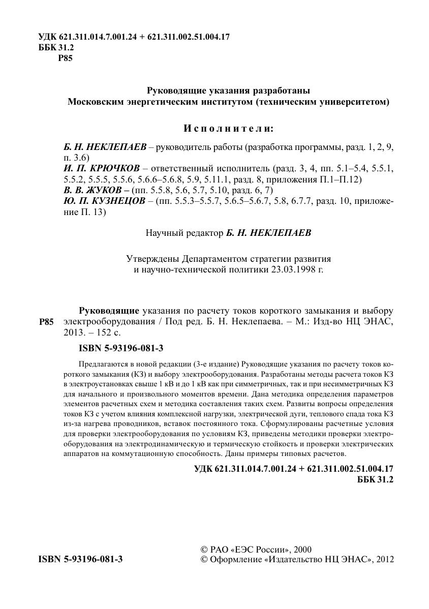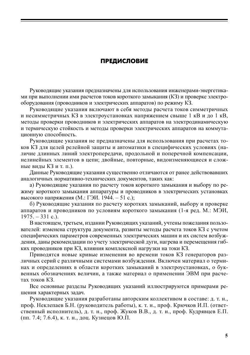Предлагаются в новой редакции (3-е издание) Руководящие указания по расчету токов короткого замыкания (КЗ) и выбору электрооборудования. Разработаны методы расчета токов КЗ в электроустановках свыше 1 кВ и до 1 кВ как при симметричных, так и при несимметричных КЗ для начального и произвольного моментов времени. Дана методика определения параметров элементов расчетных схем и методика составления таких схем. Развиты вопросы определения токов КЗ с учетом влияния комплексной нагрузки, электрической дуги, теплового спада тока КЗ из-за нагрева проводников, вставок постоянного тока. Сформулированы расчетные условия для проверки электрооборудования по условиям КЗ, приведены методики проверки электрооборудования на электродинамическую и термическую стойкость и проверки электрических аппаратов на коммутационную способность. Даны примеры типовых расчетов.
