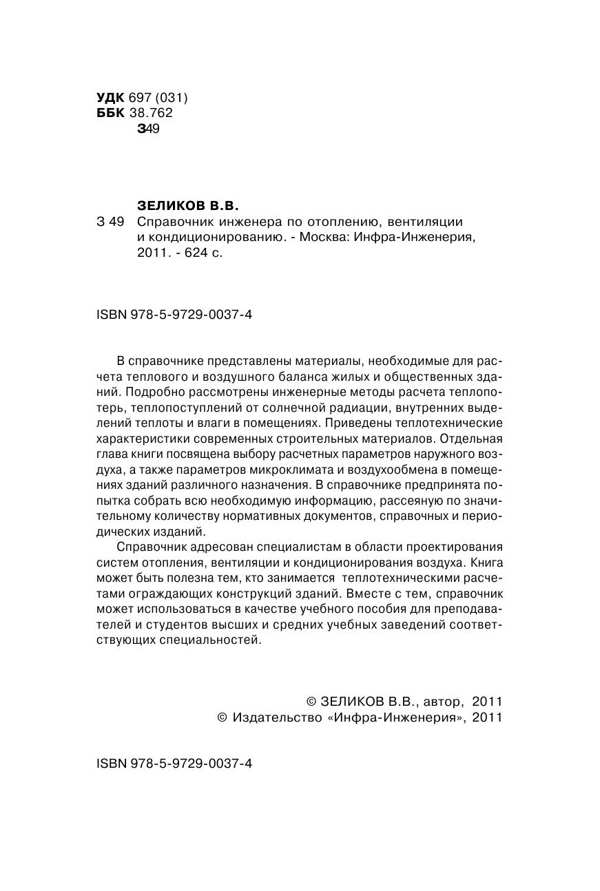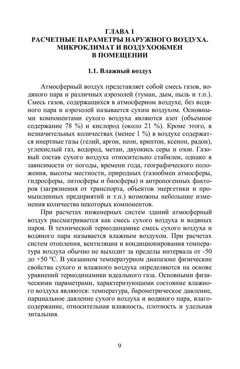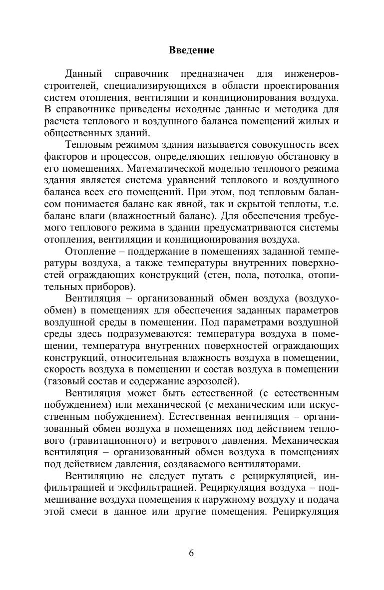 В справочнике представлены материалы, необходимые для расчета теплового и воздушного баланса жилых и общественных зданий. Подробно рассмотрены инженерные методы расчета теплопотерь, теплопоступлений от солнечной радиации, внутренних выделений теплоты и влаги в помещениях. Приведены теплотехнические характеристики современных строительных материалов. Отдельная глава книги посвящена выбору расчетных параметров наружного воздуха, а также параметров микроклимата и воздухообмена в помещениях зданий различного назначения. В справочнике предпринята попытка собрать всю необходимую информацию, рассеянную по значительному количеству нормативных документов, справочных и периодических изданий. Справочник адресован специалистам в области проектирования систем отопления, вентиляции и кондиционирования воздуха. Книга может быть полезна тем, кто занимается теплотехническими расчетами ограждающих конструкций зданий. Вместе с тем, справочник может использоваться в качестве учебного пособия для преподавателей и студентов, высших и средних учебных заведений соответствующих специальностей.