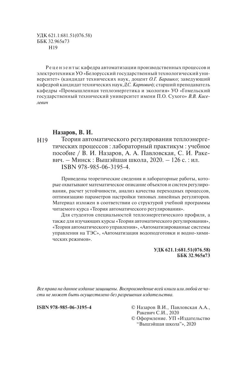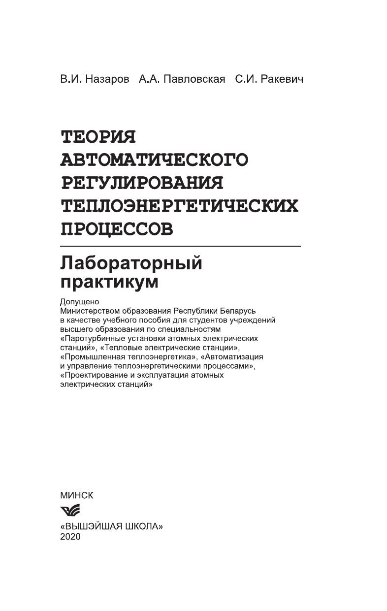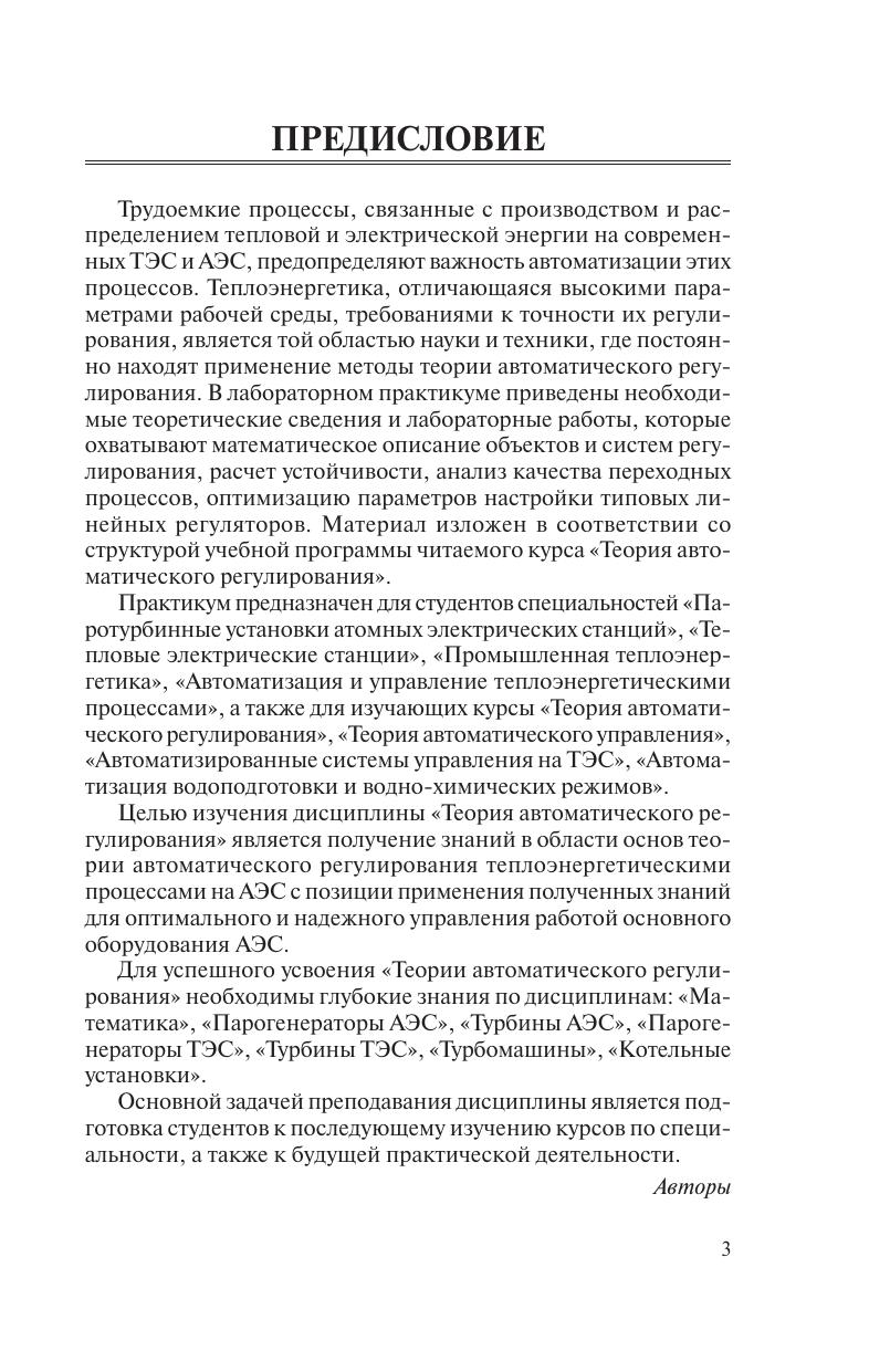 Приведены теоретические сведения и лабораторные работы, которые охватывают математическое описание объектов и систем регулирования, расчет устойчивости, анализ качества переходных процессов, оптимизацию параметров настройки типовых линейных регуляторов. Материал изложен в соответствии со структурой учебной программы читаемого курса «Теория автоматического регулирования». Для студентов специальностей теплоэнергетического профиля, а также для изучающих курсы «Теория автоматического регулирования», «Теория автоматического управления», «Автоматизированные системы управления на ТЭС», «Автоматизация водоподготовки и водно-химических режимов».