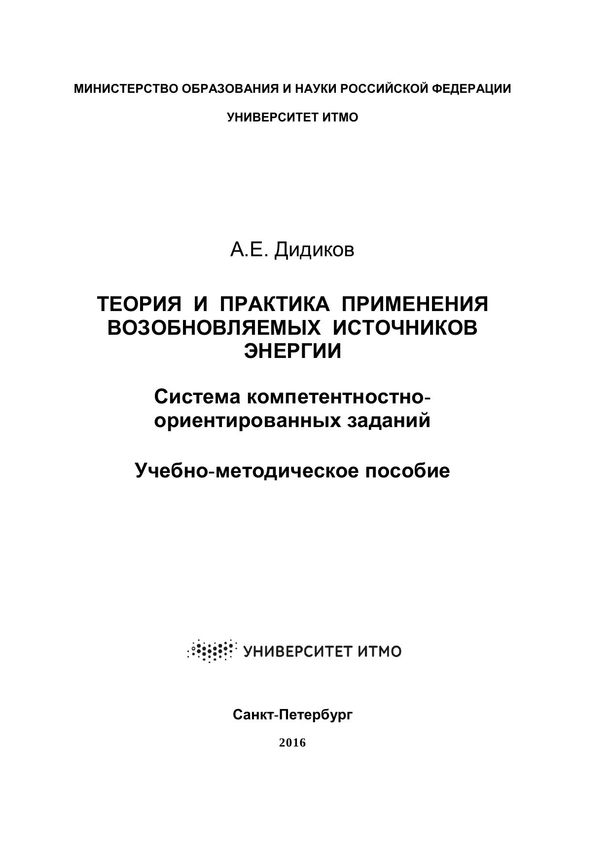 Теория и практика применения возобновляемых источников энергии. Система компетентностно-ориентированных заданий: учебно-методическое пособие