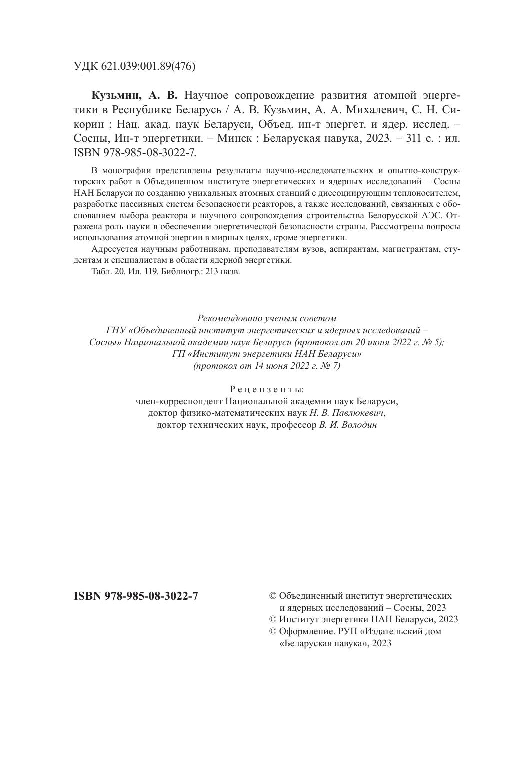 В монографии представлены результаты научно-исследовательских и опытно-конструкторских работ в Объединенном институте энергетических и ядерных исследований – Сосны НАН Беларуси по созданию уникальных атомных станций с диссоциирующим теплоносителем, разработке пассивных систем безопасности реакторов, а также исследований, связанных с обоснованием выбора реактора и научного сопровождения строительства Белорусской АЭС. Отражена роль науки в обеспечении энергетической безопасности страны. Рассмотрены вопросы использования атомной энергии в мирных целях, кроме энергетики. Адресуется научным работникам, преподавателям вузов, аспирантам, магистрантам, студентам и специалистам в области ядерной энергетики.