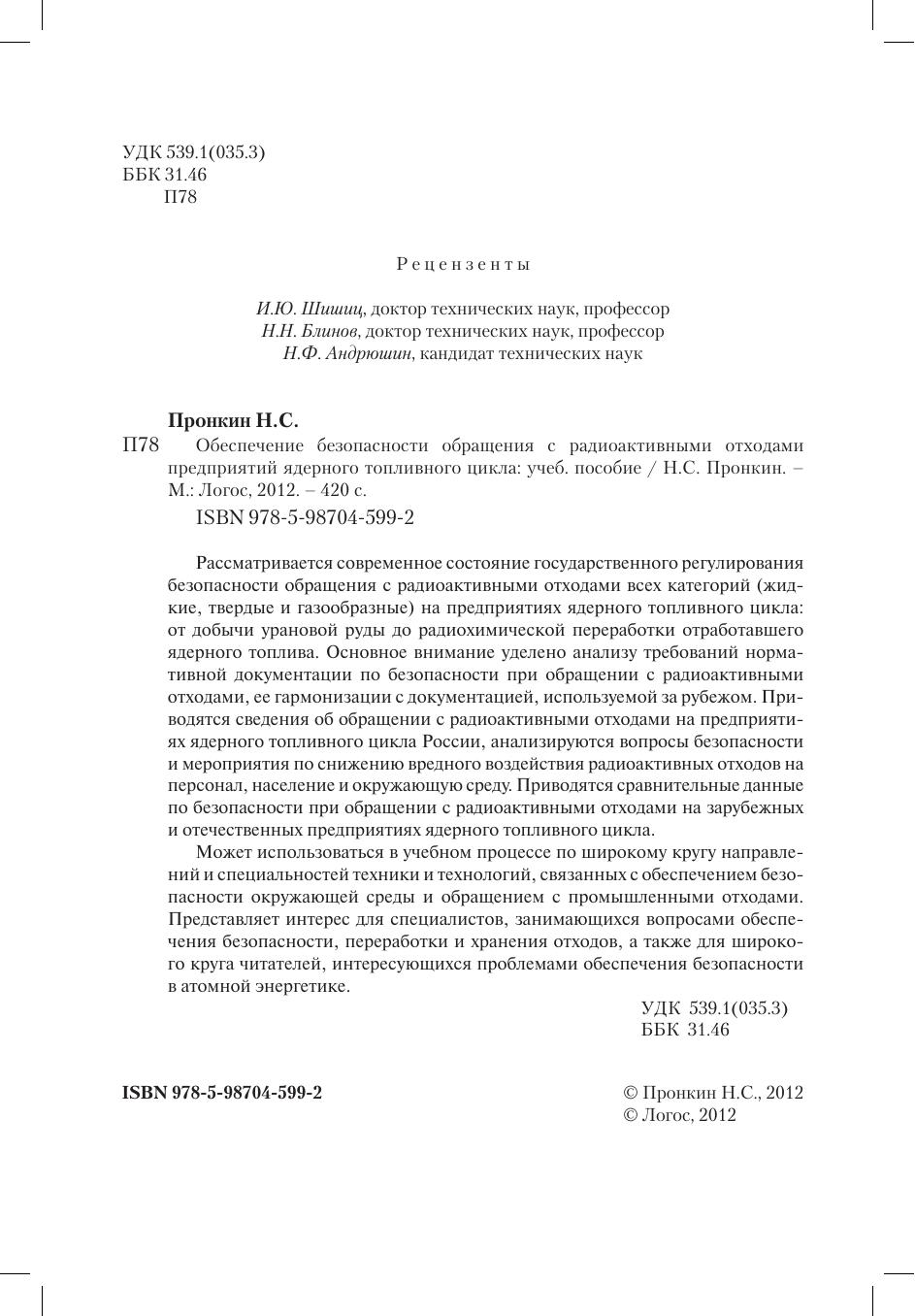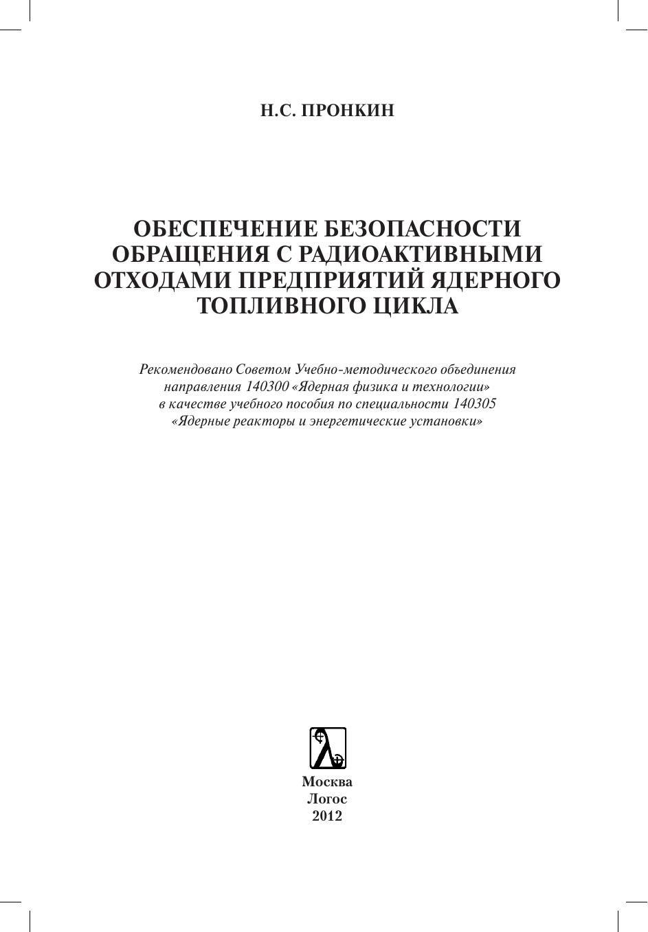 Рассматривается современное состояние государственного регулирования безопасности обращения с радиоактивными отходами всех категорий (жидкие, твердые и газообразные) на предприятиях ядерного топливного цикла: от добычи урановой руды до радиохимической переработки отработавшего ядерного топлива. Основное внимание уделено анализу требований нормативной документации по безопасности при обращении с радиоактивными отходами, ее гармонизации с документацией, используемой за рубежом. Приводятся сведения об обращении с радиоактивными отходами на предприятиях ядерного топливного цикла России, анализируются вопросы безопасности и мероприятия по снижению вредного воздействия радиоактивных отходов на персонал, население и окружающую среду. Приводятся сравнительные данные по безопасности при обращении с радиоактивными отходами на зарубежных и отечественных предприятиях ядерного топливного цикла. Может использоваться в учебном процессе по широкому кругу направлений и специальностей техники и технологий, связанных с обеспечением безопасности окружающей среды и обращением с промышленными отходами. Представляет интерес для специалистов, занимающихся вопросами обеспечения безопасности, переработки и хранения отходов, а также для широкого круга читателей, интересующихся проблемами обеспечения безопасности в атомной энергетике.