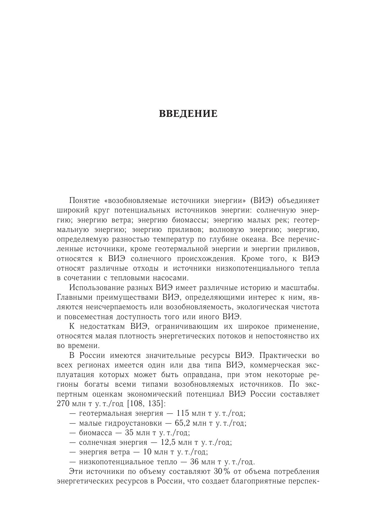 В монографии рассмотрены современное состояние и перспективы использования возобновляемых источников энергии (ВИЭ), их энергетические, экономические и экологические характеристики. Приведены технологические схемы энергетических установок, принципы их работы и основы тепловых и гидродинамических расчетов. Для научных работников, инженеров и студентов энергетических специальностей.