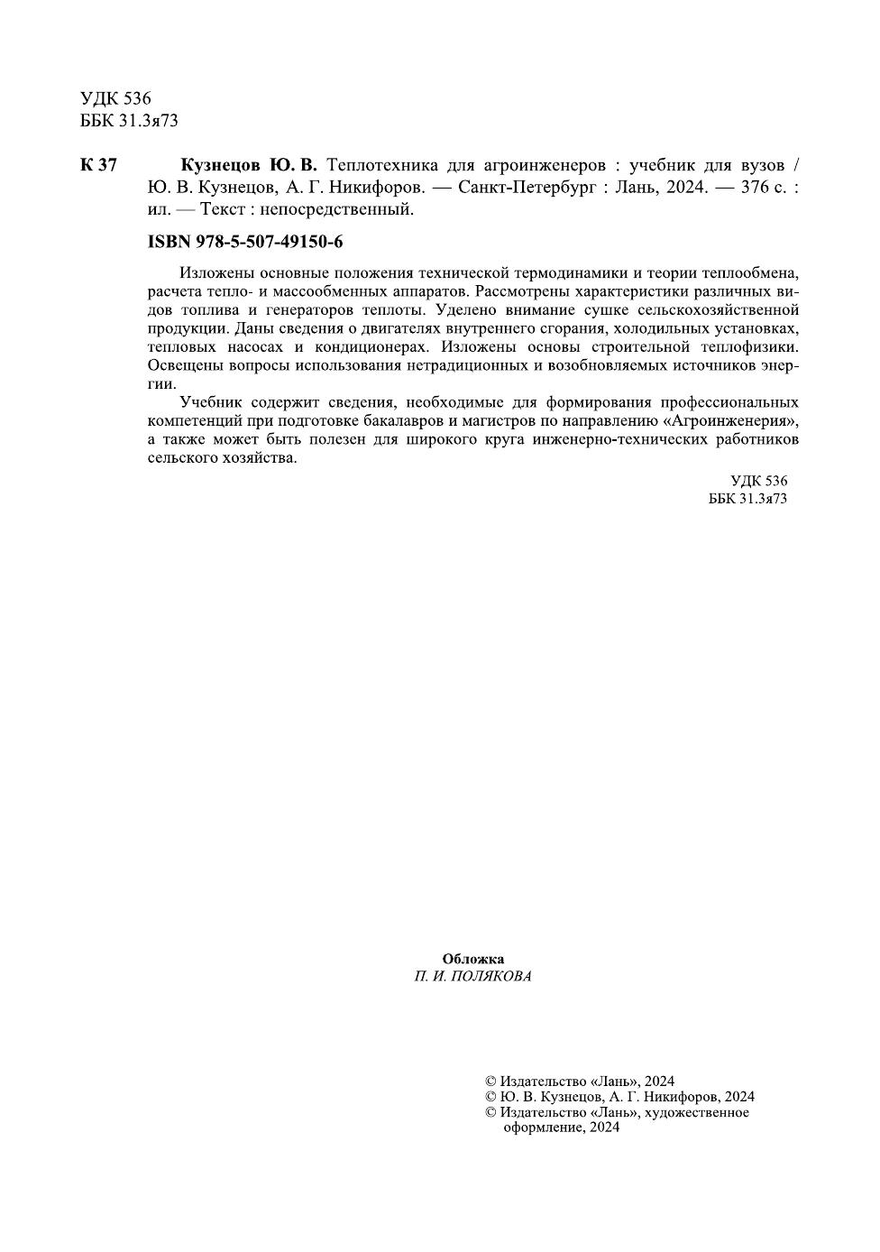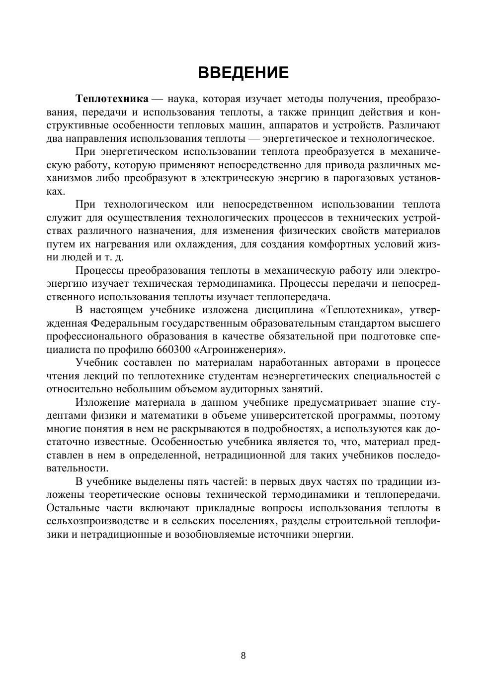 Изложены основные положения технической термодинамики и теории теплообмена, расчета тепло- и массообменных аппаратов. Рассмотрены характеристики различных видов топлива и генераторов теплоты. Уделено внимание сушке сельскохозяйственной продукции. Даны сведения о двигателях внутреннего сгорания, холодильных установках, тепловых насосах и кондиционерах. Изложены основы строительной теплофизики. Освещены вопросы использования нетрадиционных и возобновляемых источников энергии. Учебник содержит сведения, необходимые для формирования профессиональных компетенций при подготовке бакалавров и магистров по направлению «Агроинженерия», а также может быть полезен для широкого круга инженерно-технических работников сельского хозяйства.