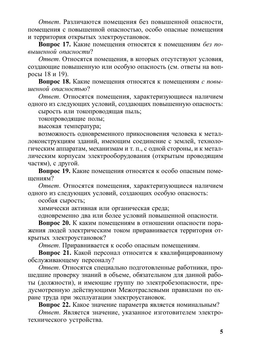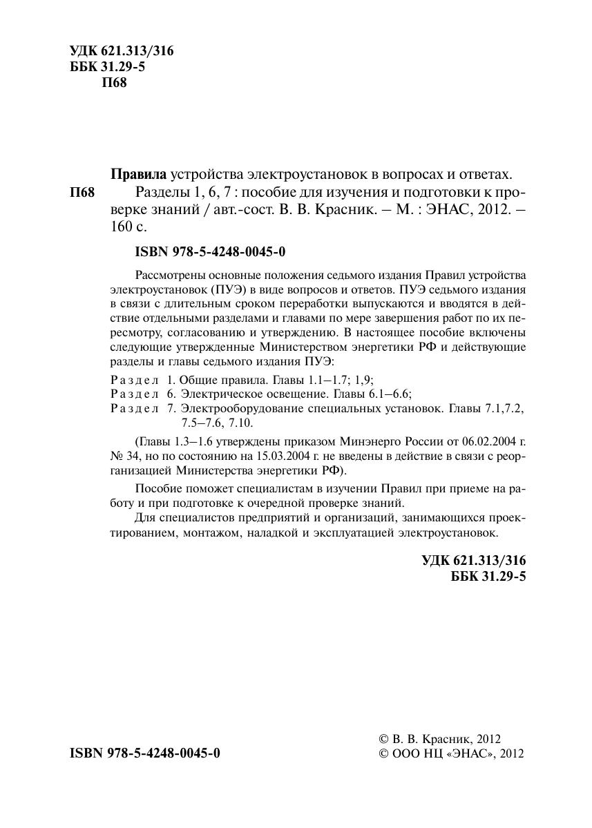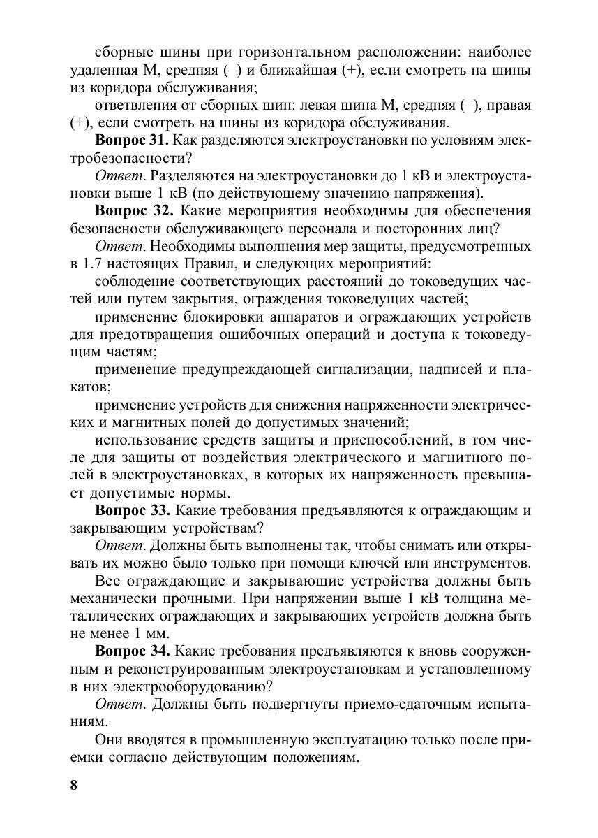 Рассмотрены основные положения седьмого издания Правил устройства электроустановок (ПУЭ) в виде вопросов и ответов. ПУЭ седьмого издания в связи с длительным сроком переработки выпускаются и вводятся в действие отдельными разделами и главами по мере завершения работ по их пересмотру, согласованию и утверждению. В настоящее пособие включены следующие утвержденные Министерством энергетики РФ и действующие разделы и главы седьмого издания ПУЭ:Раздел 1. Общие правила. Главы 1.1 - 1.7 1,9Раздел 6. Электрическое освещение. Главы 6.1 - 6.6Раздел 7. Электрооборудование специальных установок. Главы 7.1, 7.2, 7.5 - 7.6, 7.10.(Главы 1.3 - 1.6 утверждены приказом Минэнерго России от 06.02.2004 г. № 34, но по состоянию на 15.03.2004 г. не введены в действие в связи с реорганизацией Министерства энергетики РФ).Пособие поможет специалистам в изучении Правил при приеме на работу и при подготовке к очередной проверке знаний.