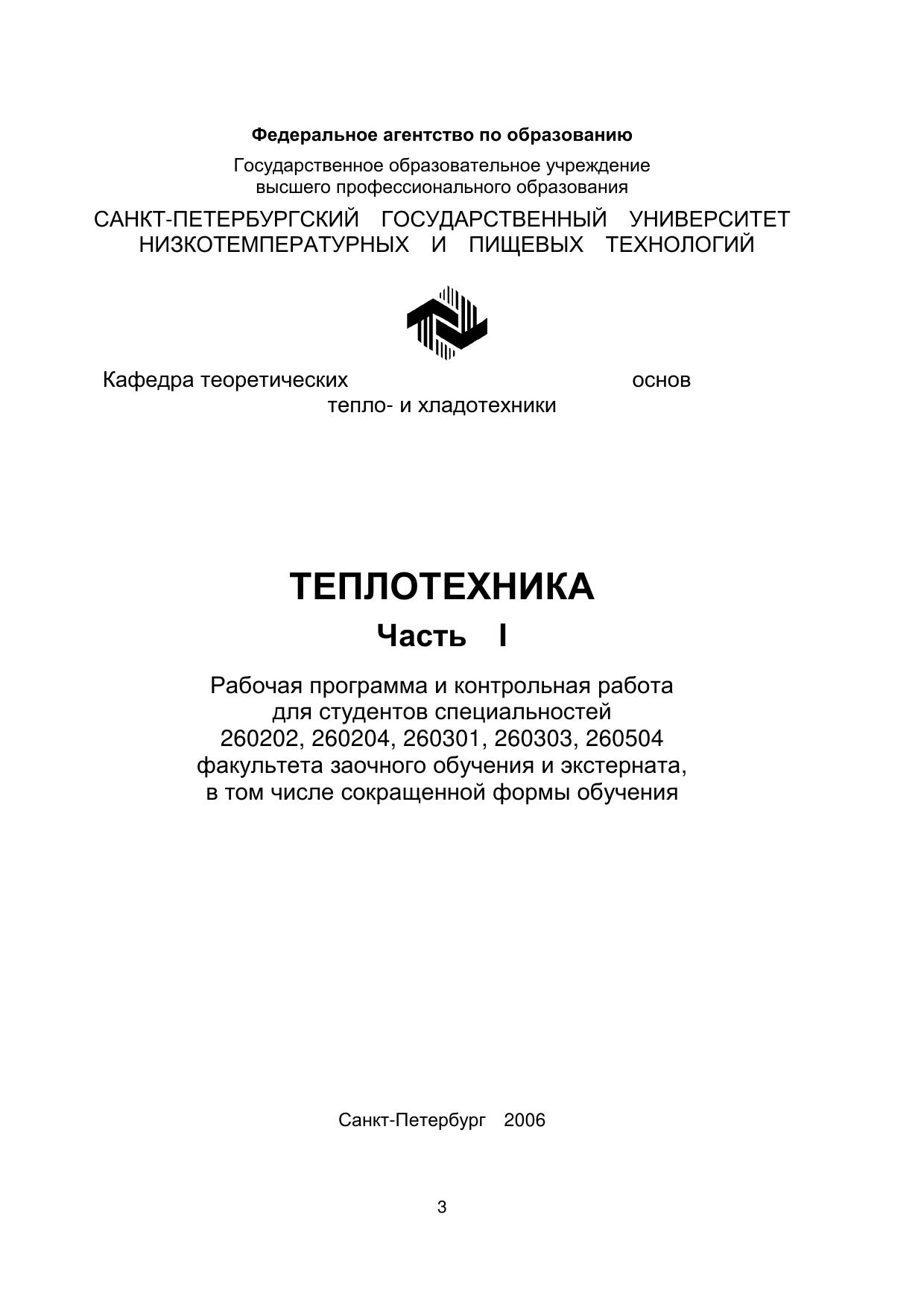 Теплотехника. Часть I: Раб. программа и контрольная работа
