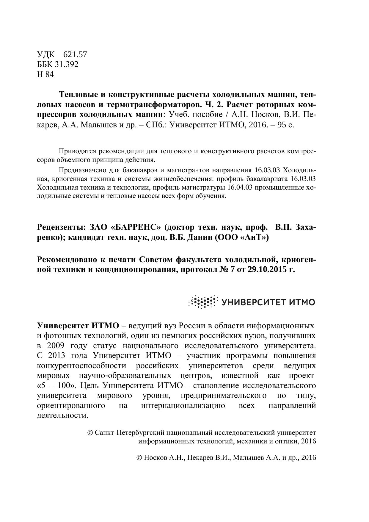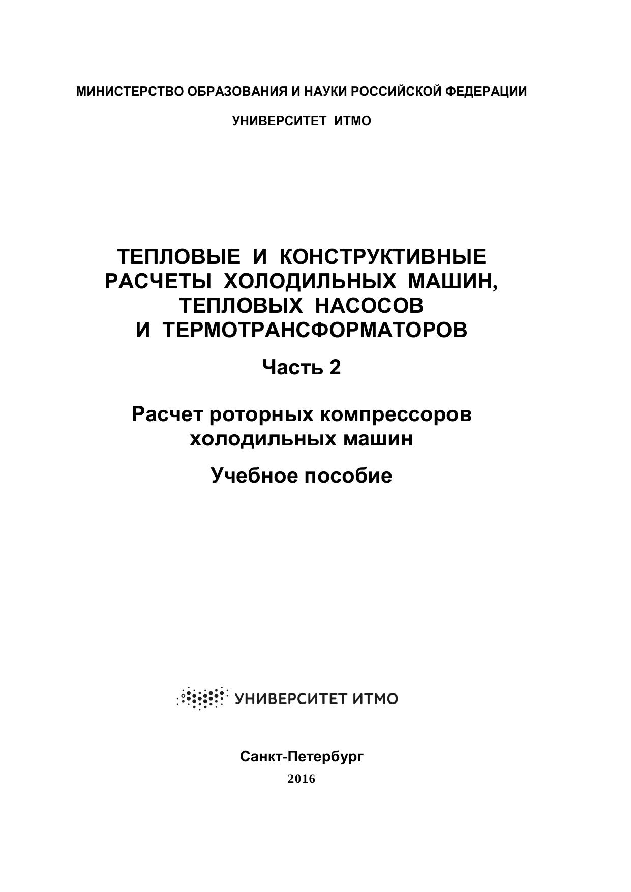 Тепловые и конструктивные расчеты холодильных машин, тепловых насосов и термотрансформаторов. Ч. 2. Расчет роторных компрессоров холодильных машин: учебное пособие