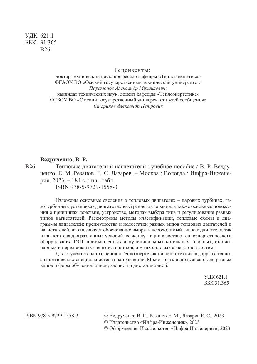 Изложены основные сведения о тепловых двигателях – паровых турбинах, газотурбинных установках, двигателях внутреннего сгорания, а также основные положения о принципах действия, устройстве, методах выбора типа и регулирования разных типов нагнетателей. Рассмотрены методы классификации, тепловые схемы и диаграммы двигателей; преимущества и недостатки разных видов тепловых двигателей и нагнетателей, что позволяет обоснованно выбрать необходимый тип как двигателя, так и нагнетателя для различных условий их эксплуатации в составе теплоэнергетического оборудования ТЭЦ, промышленных и муниципальных котельных; блочных, стационарных и передвижных энергоисточников, других силовых агрегатов и систем.
