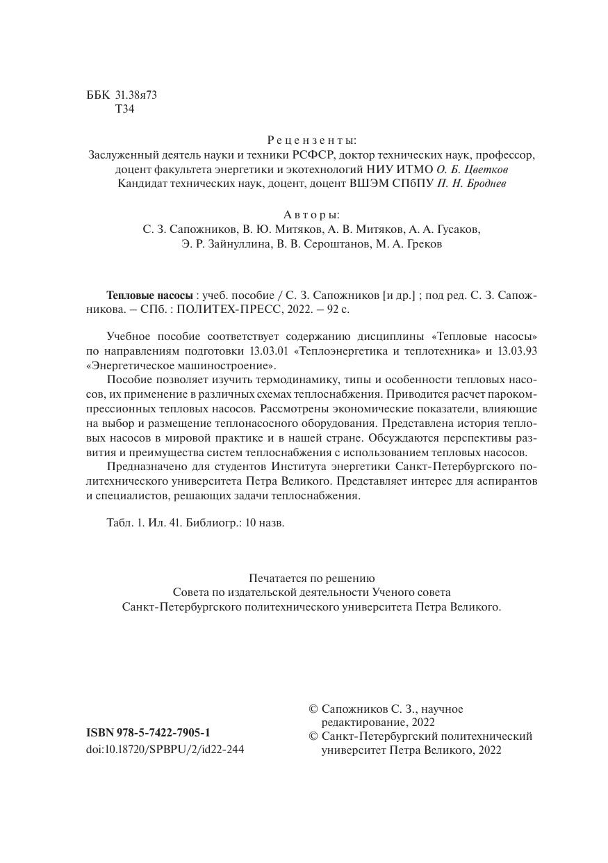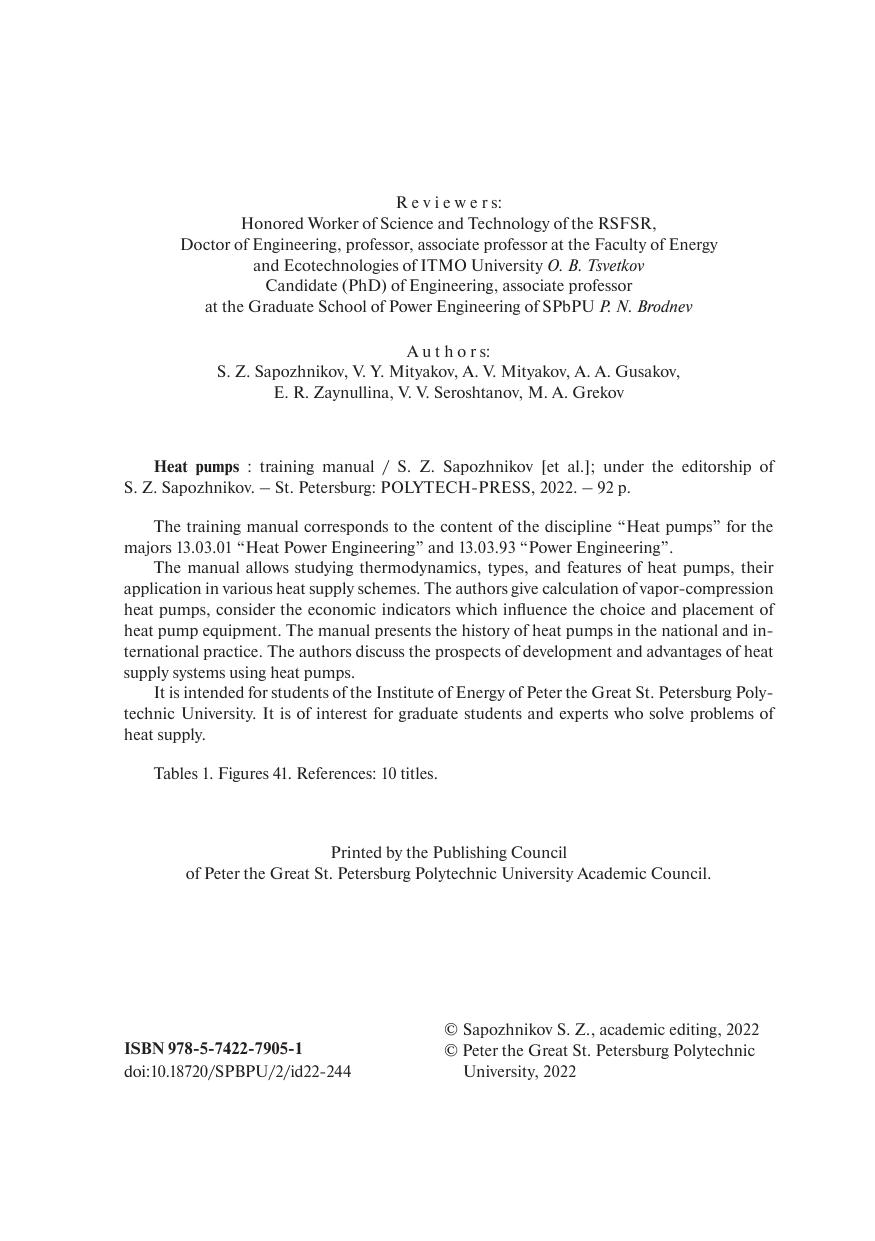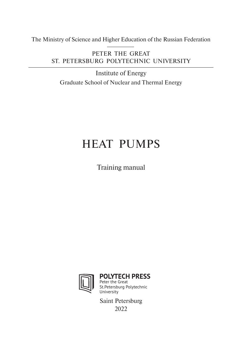 на выбор и размещение теплонасосного оборудования. Представлена история тепловых насосов в мировой практике и в нашей стране. Обсуждаются перспективы развития и преимущества систем теплоснабжения с использованием тепловых насосов. Предназначено для студентов Института энергетики Санкт-Петербургского политехнического университета Петра Великого. Представляет интерес для аспирантов и специалистов, решающих задачи теплоснабжения.