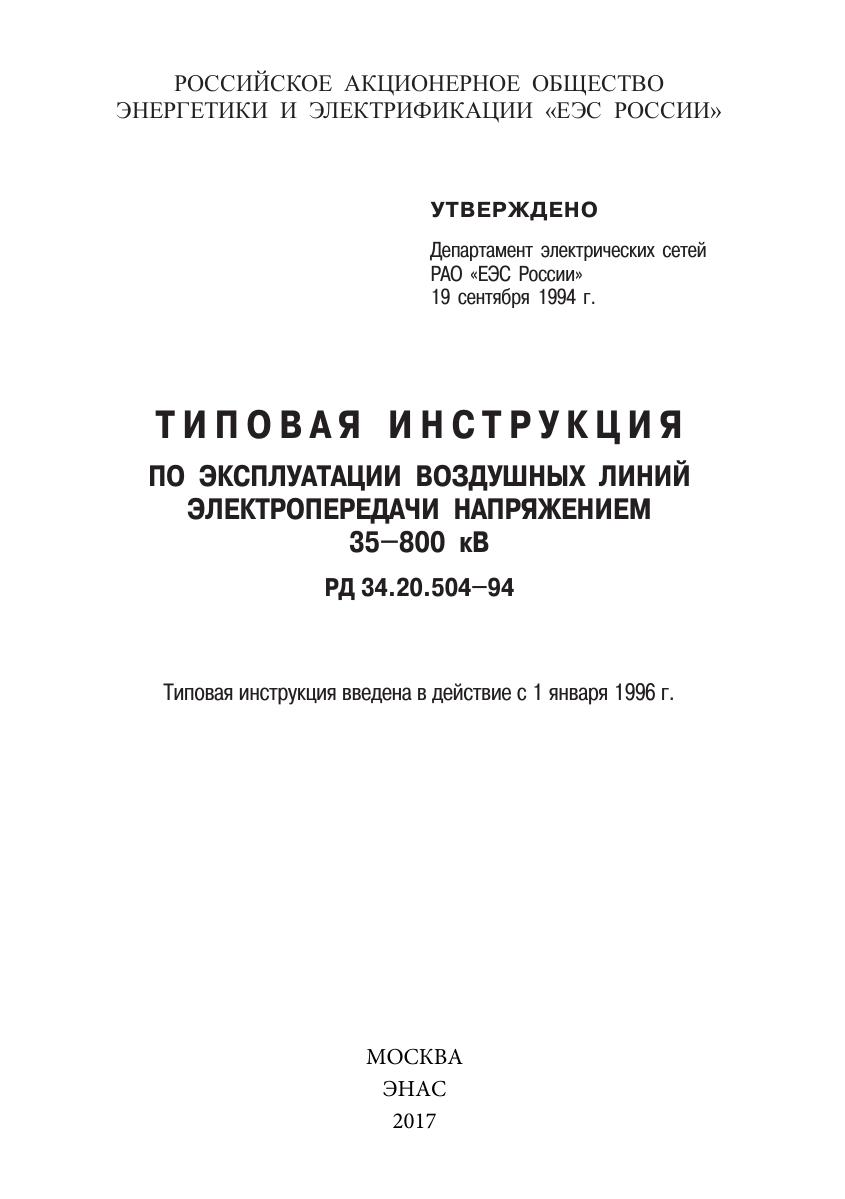 Типовая инструкция по эксплуатации воздушных линий электропередачи напряжением 35-800 кВ. РД 34.20.504-94