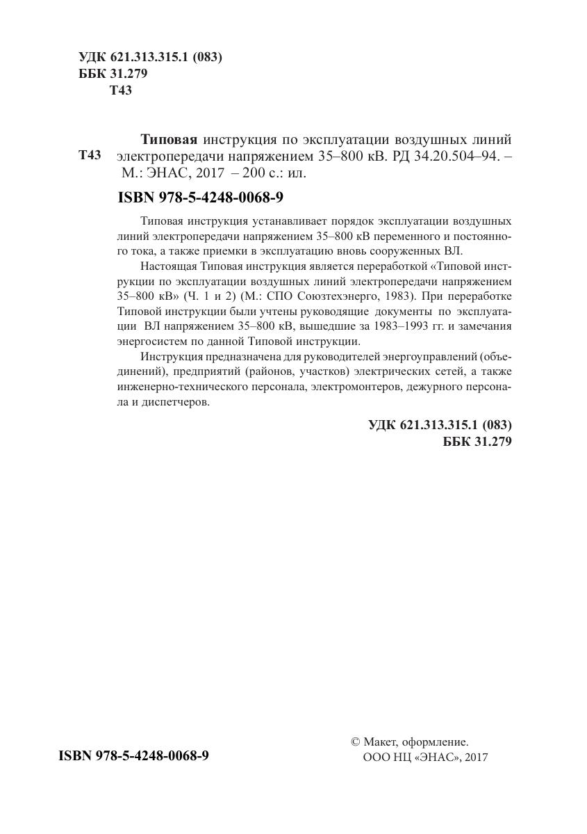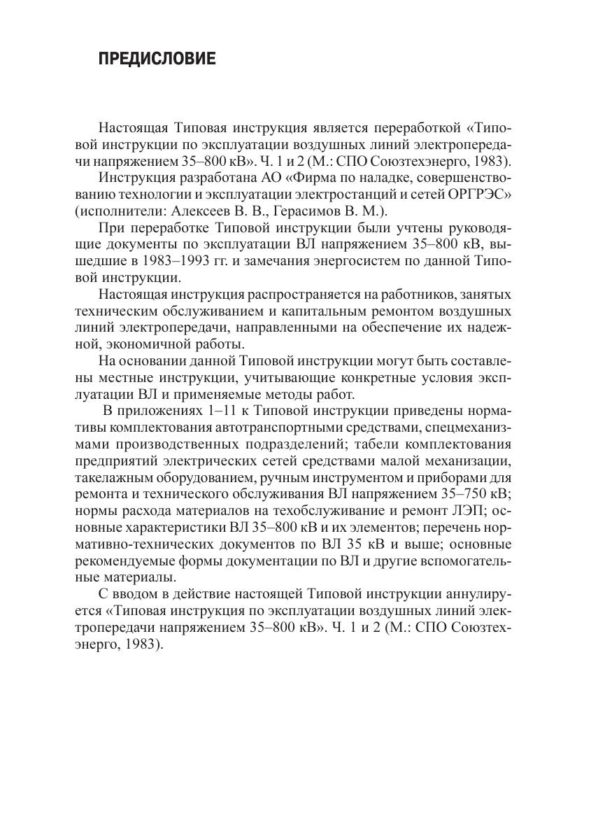 Типовая инструкция устанавливает порядок эксплуатации воздушных линий электропередачи напряжением 35-800 кВ переменного и постоянного тока, а также приемки в эксплуатацию вновь сооруженных ВЛ. Настоящая Типовая инструкция является переработкой «Типовой инструкции по эксплуатации воздушных линий электропередачи напряжением 35-800 кВ» (Ч. 1 и 2) (М.: СПО Союзтехэнерго, 1983). При переработке Типовой инструкции были учтены руководящие документы по эксплуатации ВЛ напряжением 35-800 кВ, вышедшие за 1983-1993 гг. и замечания энергосистем по данной Типовой инструкции. Инструкция предназначена для руководителей энергоуправлений (объединений), предприятий (районов, участков) электрических сетей, а также инженерно-технического персонала, электромонтеров, дежурного персонала и диспетчеров.