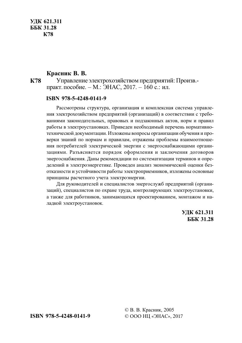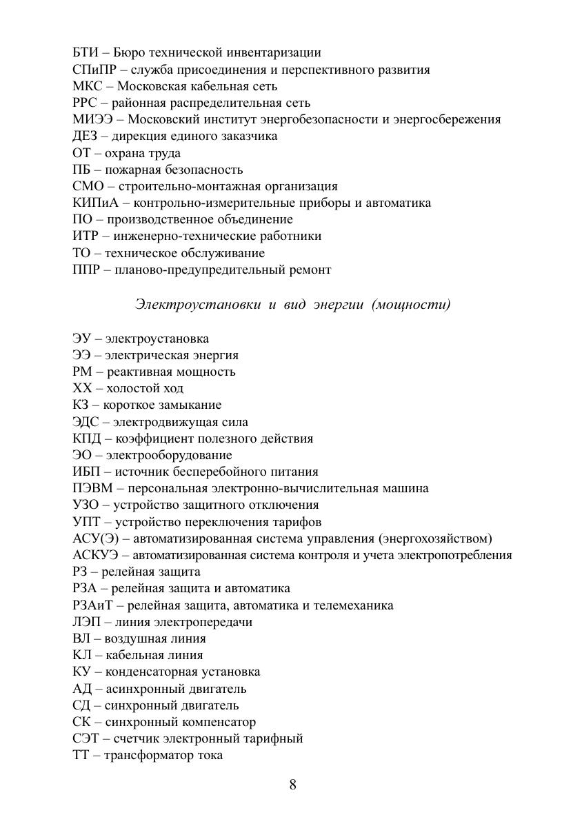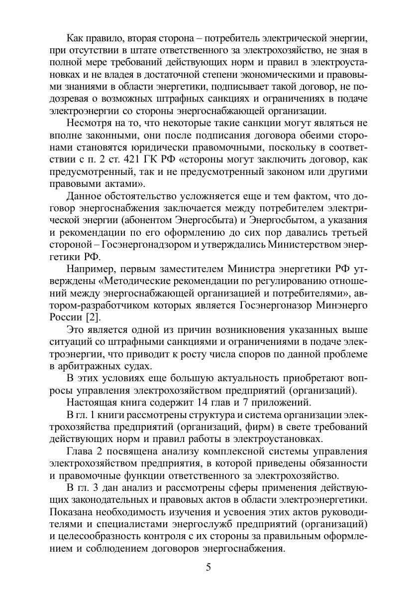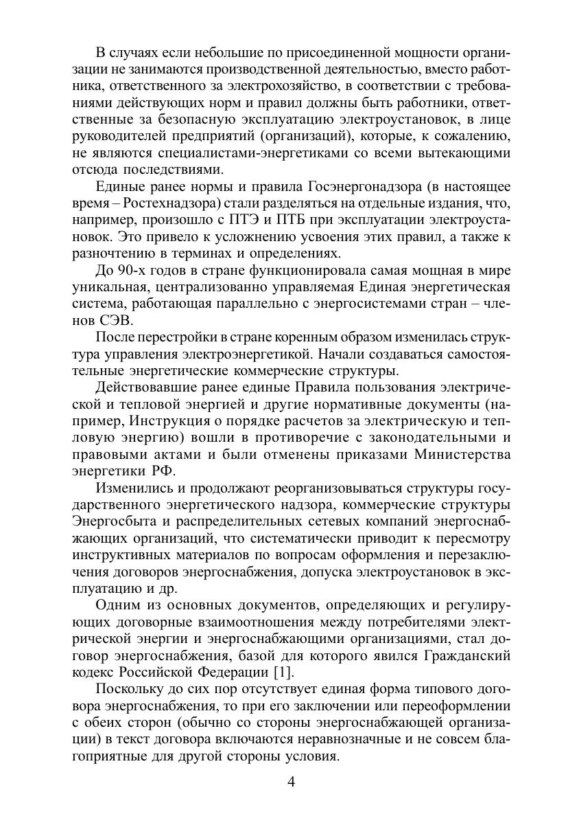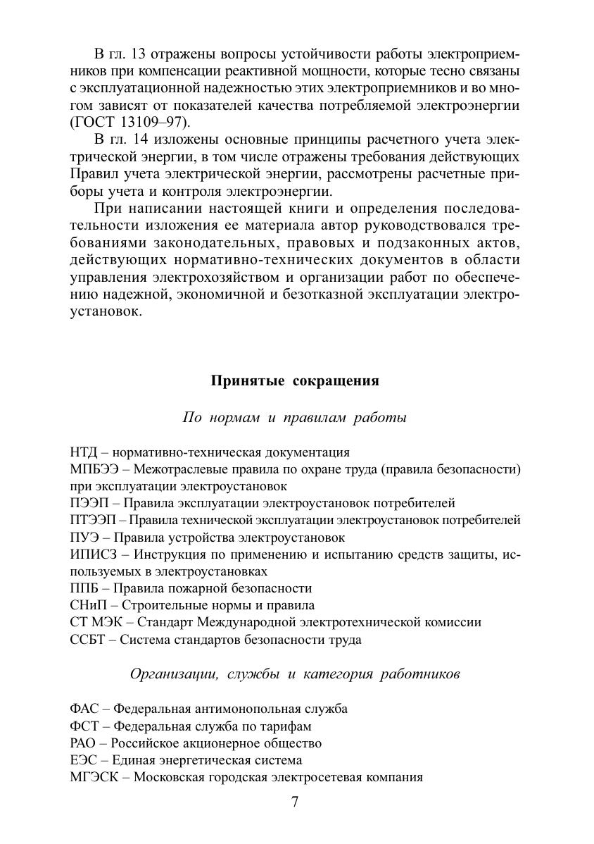 Рассмотрены структура, организация и комплексная система управления электрохозяйством предприятий (организаций) в соответствии с требованиями законодательных, правовых и подзаконных актов, норм и правил работы в электроустановках. Приведен необходимый перечень нормативно-технической документации. Изложены вопросы организации обучения и проверки знаний по нормам и правилам, отражены проблемы взаимоотношения потребителей электрической энергии с энергоснабжающими организациями. Разъясняется порядок оформления и заключения договоров энергоснабжения. Даны рекомендации по систематизации терминов и определений в электроэнергетике. Проведен анализ экономической оценки безотказности и устойчивости работы электроприемников, изложены основные принципы расчетного учета электроэнергии. Для руководителей и специалистов энергослужб предприятий (организаций), специалистов по охране труда, контролирующих электроустановки, а также для работников, занимающихся проектированием, монтажом и наладкой электроустановок.