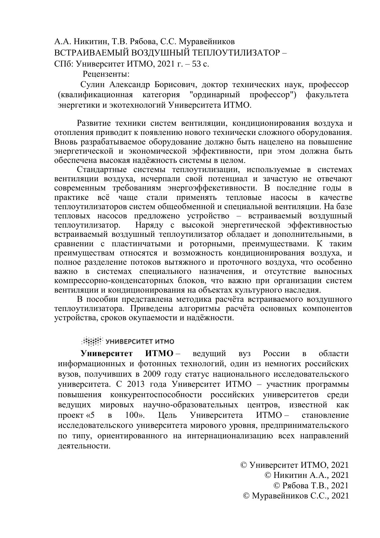 В пособии представлена методика расчёта встраиваемого воздушного теплоутилизатора. Приведены алгоритмы расчёта основных компонентов устройства, сроков окупаемости и надёжности.