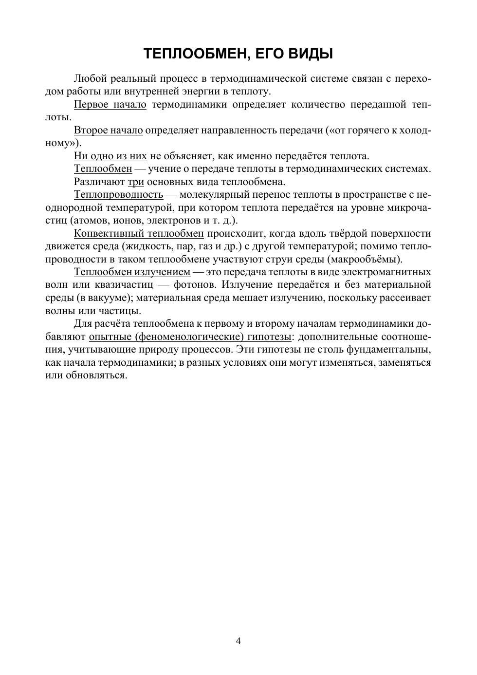 Учебное пособие вводит основные понятия теплообмена. В число основных разделов входят понятия о видах теплообмена и три основных раздела, посвящённых теплопроводности, конвективному теплообмену и теплообмену излучением. Рассмотрены интегральное и дифференциальное уравнения теплопроводности, задачи стационарной теплопроводности при граничных условиях первого и третьего рода, нестационарная теплопроводность, инженерные методы расчёта теплопроводности. Сформулирована краевая задача конвективного теплообмена, изложены основы теории подобия. Описан теплообмен в однофазной жидкости при вынужденной и свободной конвекции, теплообмен при кипении и конденсации. Представлены конструкторский и поверочный расчёт теплообменников. Изложены физические основы, законы и методы расчёта теплообмена излучением. Пособие построено на материале семестрового курса лекций для студентов теплоэнергетических, энергомашиностроительных и других специальностей, основанных на идеях и методах теплообмена. Может быть полезным для всех интересующихся передачей теплоты в различных областях.