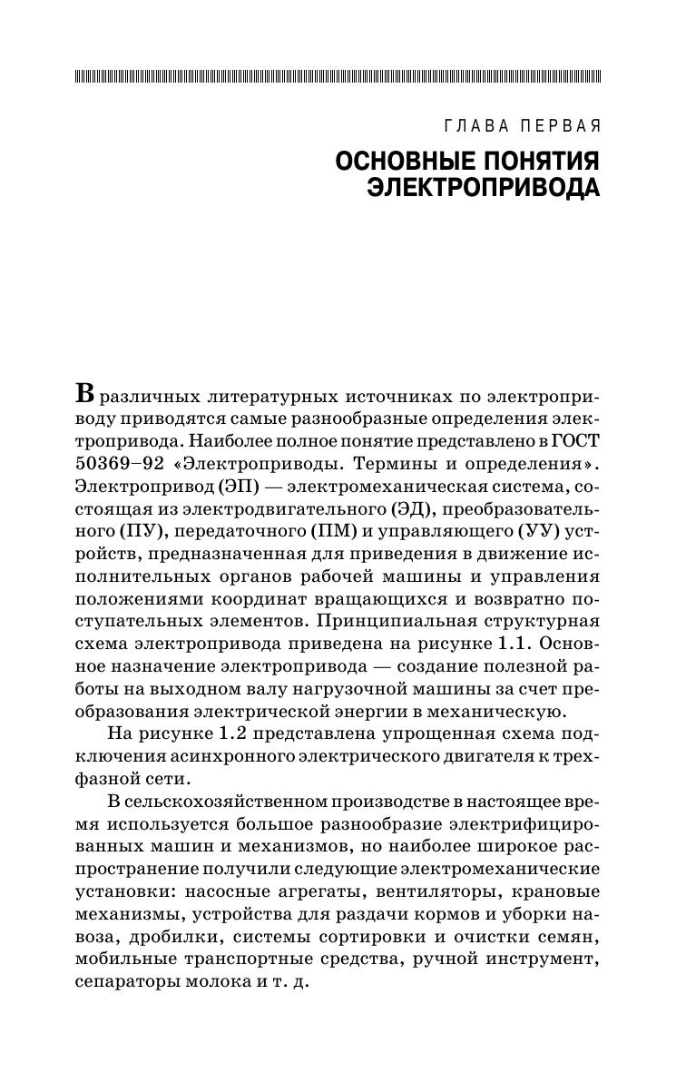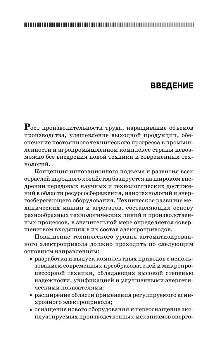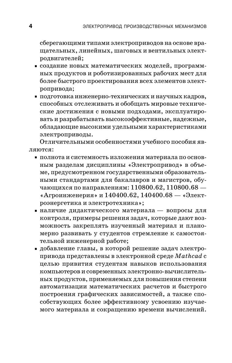 Учебное пособие содержит подробное изложение основных разделов дисциплины «Электропривод» в соответствии с требованиями государственных общеобразовательных стандартов для бакалавров и магистров, обучающихся по направлениям «Агроинженерия» и «Электроэнергетика и электротехника». В пособии даются основные понятия электрического привода, рассматриваются вопросы электропривода постоянного и переменного тока. Изложены основы динамики и энергетики, а также особенности работы электроприводов в сельскохозяйственном производстве. Приведены примеры решений типовых задач в электронной среде Mathcad. Учебное пособие предназначено для студентов высших учебных заведений, аспирантов, преподавателей и слушателей ФПК.