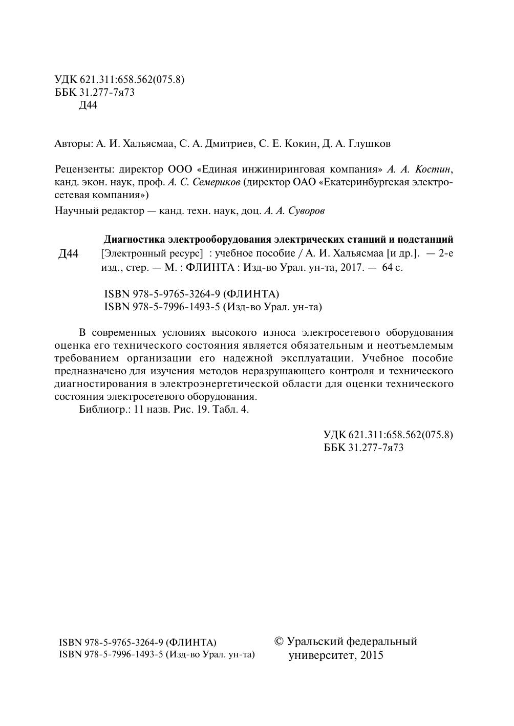 В современных условиях высокого износа электросетевого оборудования оценка его технического состояния является обязательным и неотъемлемым требованием организации его надежной эксплуатации. Учебное пособие предназначено для изучения методов неразрушающего контроля и технического диагностирования в электроэнергетической области для оценки технического состояния электросетевого оборудования.