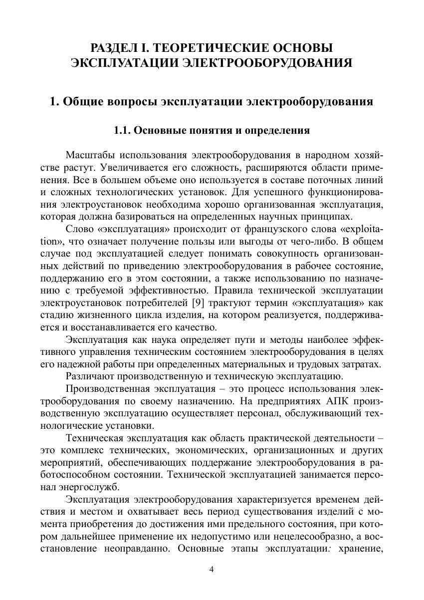Изложены теоретические и практические положения эксплуатации электрооборудования. Рассматриваются вопросы надежности, диагностики, технической эксплуатации, организации и управления электротехническими службами. Соответствует современным требованиям Федерального государственного образовательного стандарта среднего профессионального образования и профессиональным квалификационным требованиям. Учебное пособие рекомендуется студентам средних специальных учебных заведений, обучающимся по специальности «Электрификация и автоматизация сельского хозяйства».