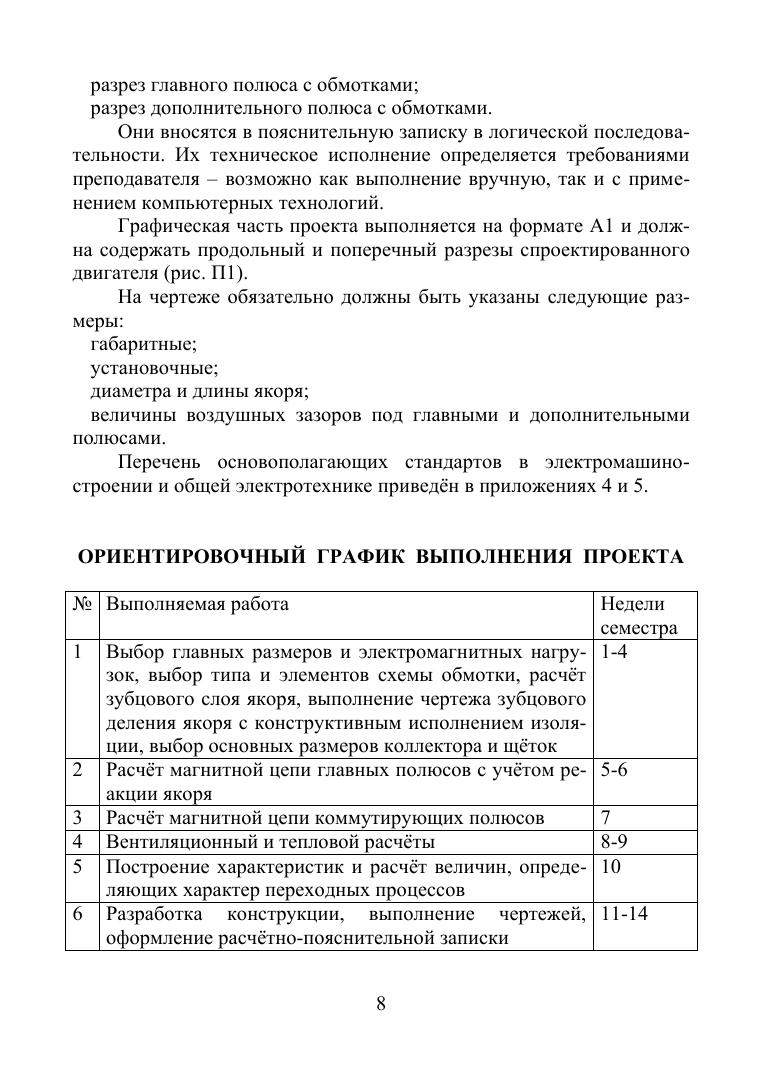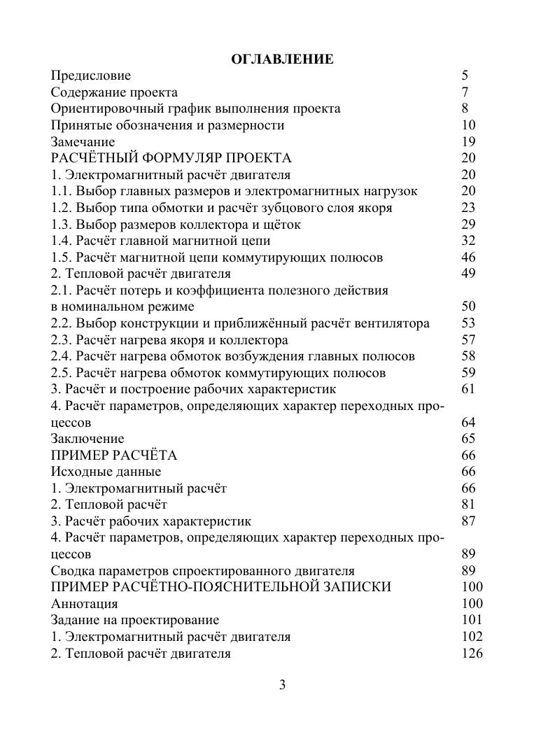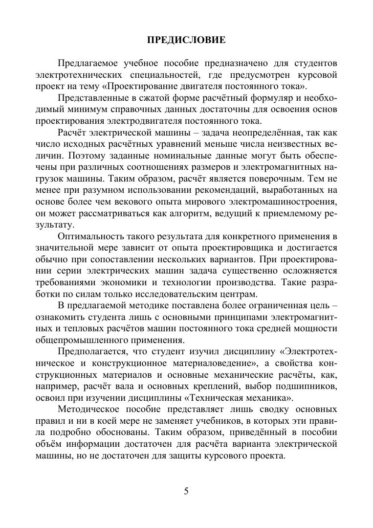 Предлагаемое учебное пособие включает в себя минимальную информацию, достаточную для освоения основ проектирования электродвигателя постоянного тока, и состоит из трёх основных разделов. В первом из них содержится расчётный формуляр проекта, состоящий из электромагнитного и теплового расчётов двигателя, расчёта и построения рабочих характеристик и параметров, определяющих характер переходных процессов. Во втором разделе приведены пример расчёта двигателя и сводка всех его параметров, позволяющая приступить к выполнению графической части проекта. Третьим разделом является пример оформления пояснительной записки и чертежей.