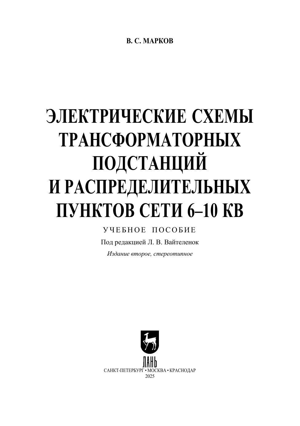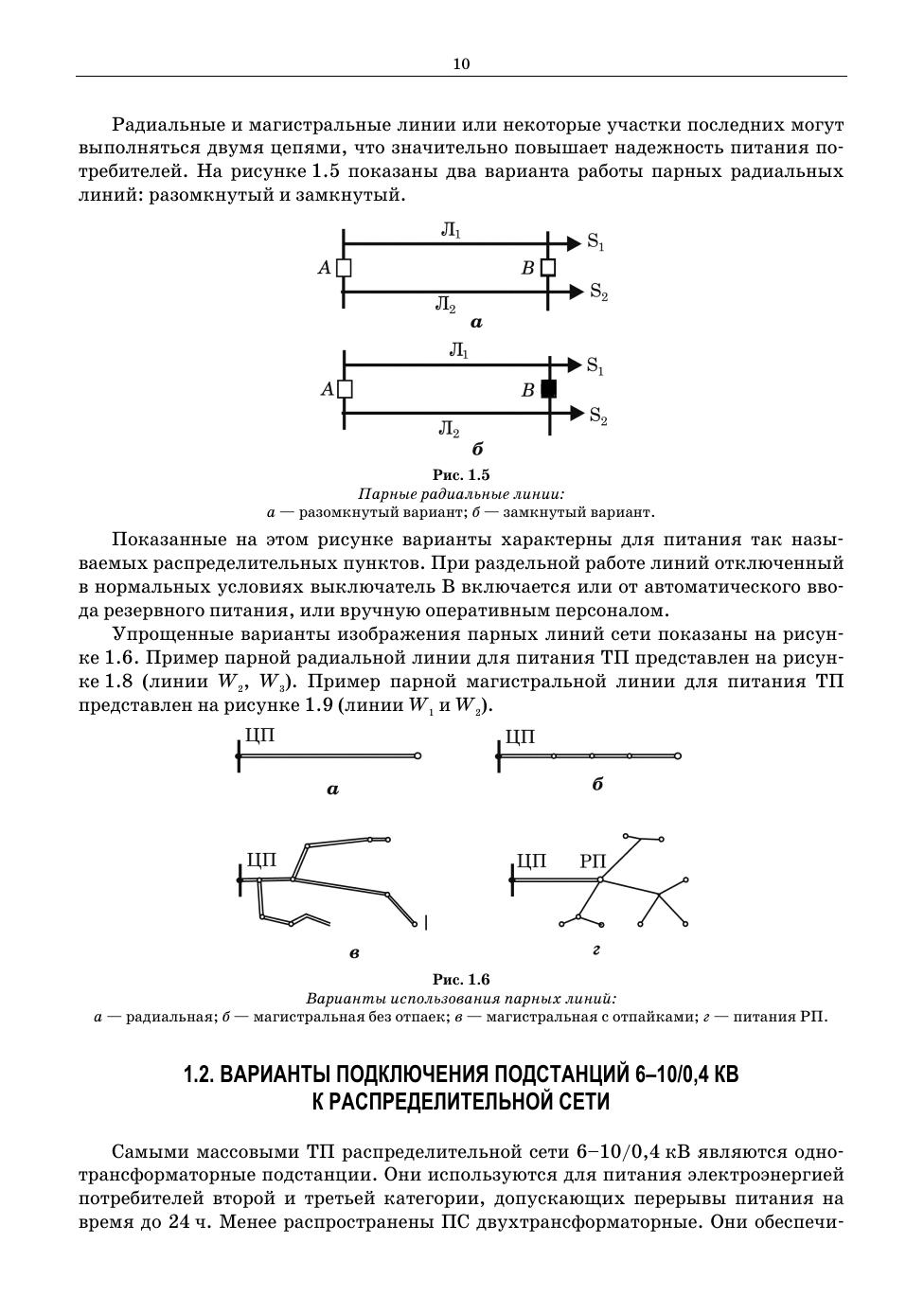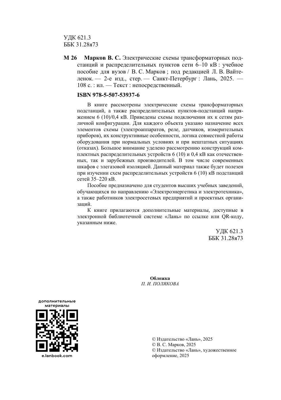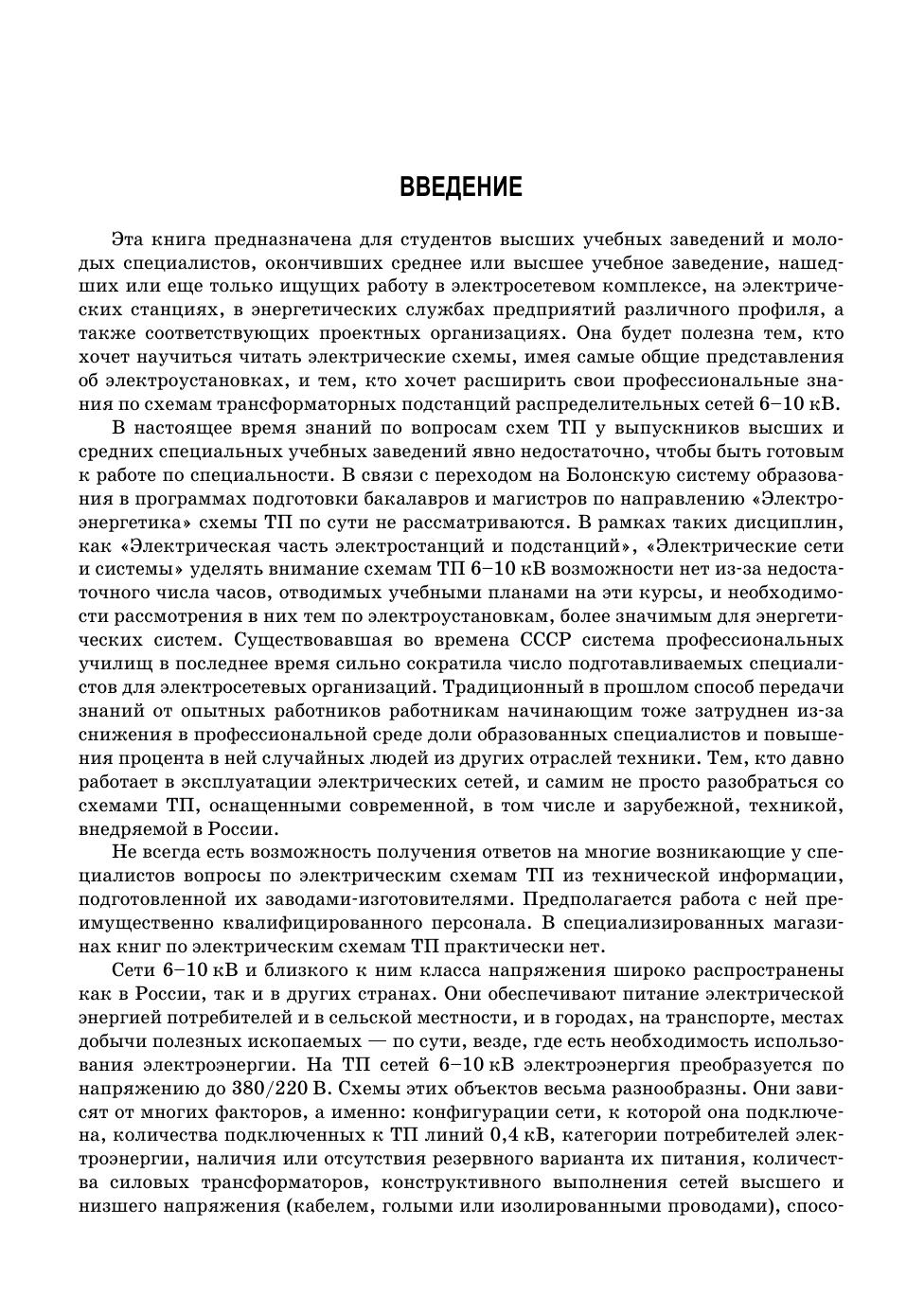 В книге рассмотрены электрические схемы трансформаторных подстанций, а также распределительных пунктов-подстанций напряжением 6 (10)/0,4 кВ. Приведены схемы подключения их к сетям различной конфигурации. Для каждого объекта указано назначение всех элементов схемы (электроаппаратов, реле, датчиков, измерительных приборов), их конструктивные особенности, логика совместной работы оборудования при нормальных условиях и при нештатных ситуациях (отказах). Большое внимание уделено рассмотрению конструкций комплектных распределительных устройств 6(10) и 0,4кВ как отечественных, так и зарубежных производителей. В том числе современных шкафов с элегазовой изоляцией. Данный материал также будет полезен при изучении схем распределительных устройств 6 (10) кВ подстанций сетей 35–220 кВ. Пособие предназначено для студентов высших учебных заведений, обучающихся по направлению «Электроэнергетика и электротехника», а также работников электросетевых предприятий и проектных организаций. К книге прилагаются дополнительные материалы, доступные в электронной библиотечной системе «Лань» по ссылке или QR-коду, указанным ниже.