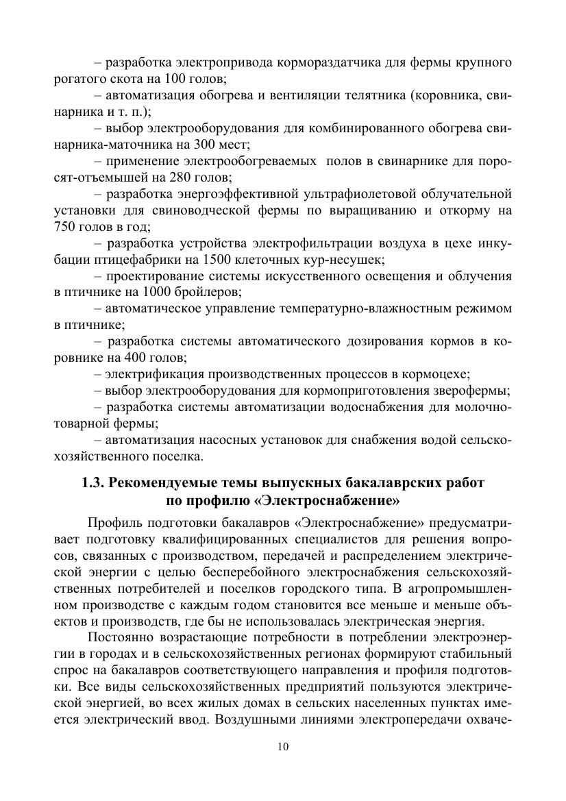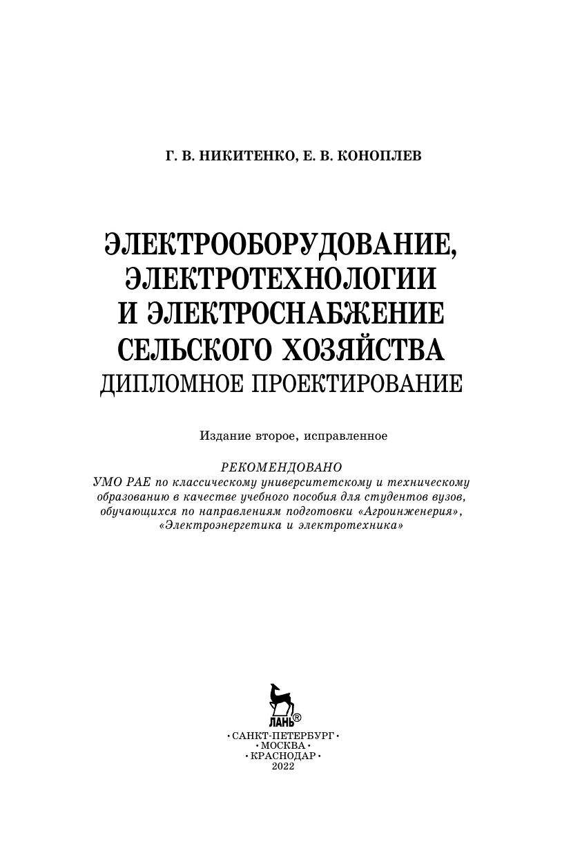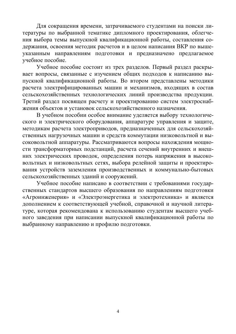 Изложена методика написания и требования, предъявляемые к выпускной квалификационной работе по направлениям подготовки «Агроинжинерия» (профиль «Электрооборудование и электротехнологии для сельского хозяйства»), «Электроэнергетика и электротехника» (профиль «Электроснабжение»). Представлены краткие сведения по теории и справочные материалы, необходимые для проектирования комплексной электрификации и автоматизации сельскохозяйственного производства. Изложены рекомендации по выбору электрооборудования и электрических приводов агропромышленных предприятий. Рассмотрены вопросы, связанные с расчетом электрических нагрузок, токов короткого замыкания, выбором трансформаторных подстанций и определением потерь энергии в электрических сетях сельскохозяйственного назначения. Приведены примеры решения типовых задач. Дано описание программы для автоматизированного расчета распределительных сетей до 35 кВ. Для учащихся высших учебных заведений, осваивающих общеобразовательные программы подготовки бакалавриата.