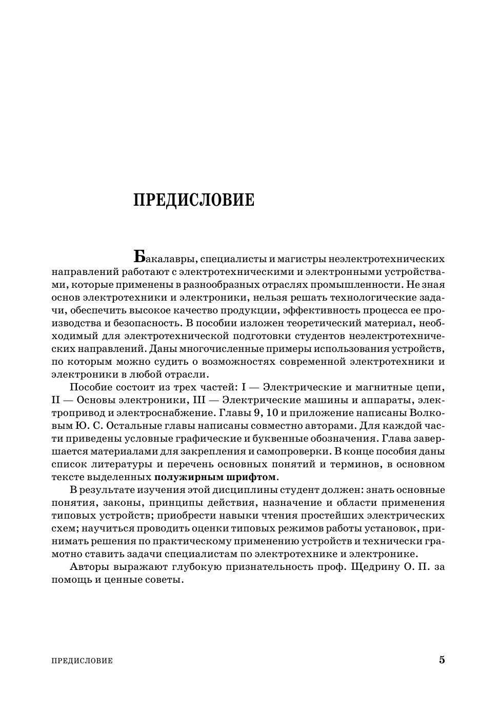 Пособие предназначено для студентов неэлектротехнических направлений и профилей политехнических вузов всех форм обучения — дневной, вечерней и заочной, изучающих дисциплины «Электротехника и электроника», «Общая электротехника и электроника». Большое внимание уделено практическому применению электротехнических и электронных устройств: назначению, принципу действия, техническим возможностям, особенностям эксплуатации. Даны примеры расчета величин, состояния цепей и типовых режимов электрических машин и трансформаторов, выбора двигателя и токоподвода. Каждая глава завершается материалами для закрепления прочитанного и самопроверки усвоения. Пособие содержит словарь основных понятий и терминов, перечень условных обозначений, обширный иллюстративный материал.