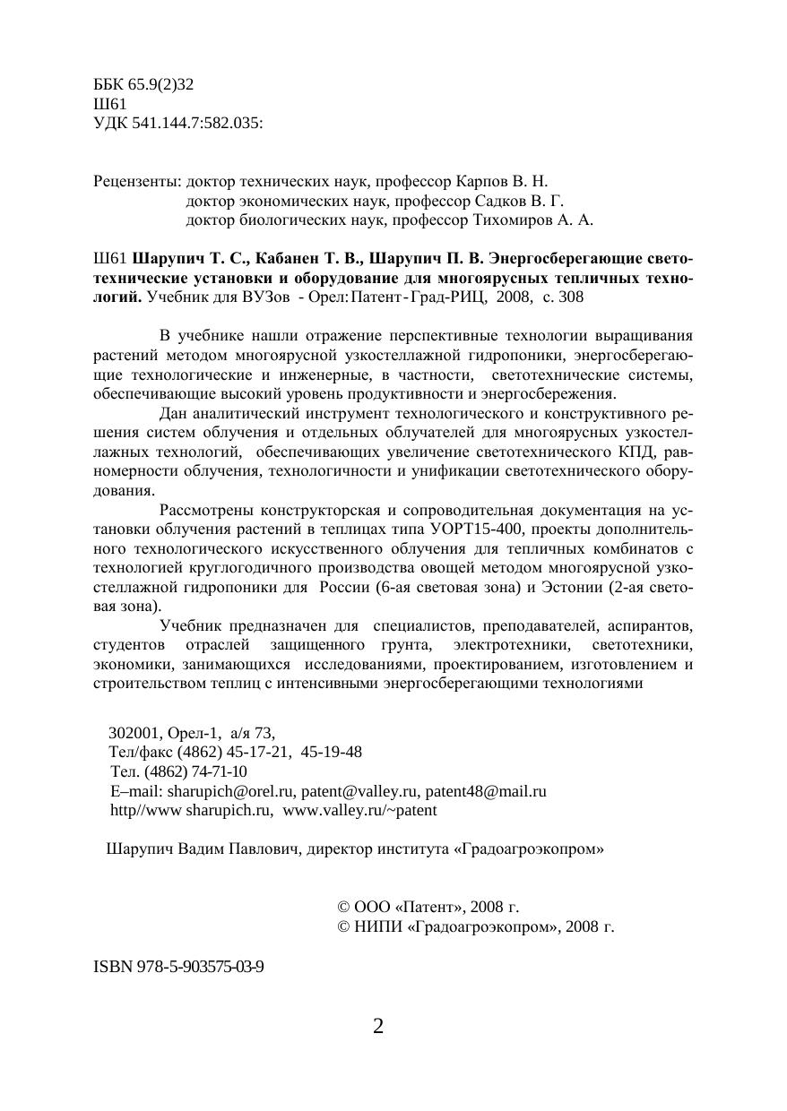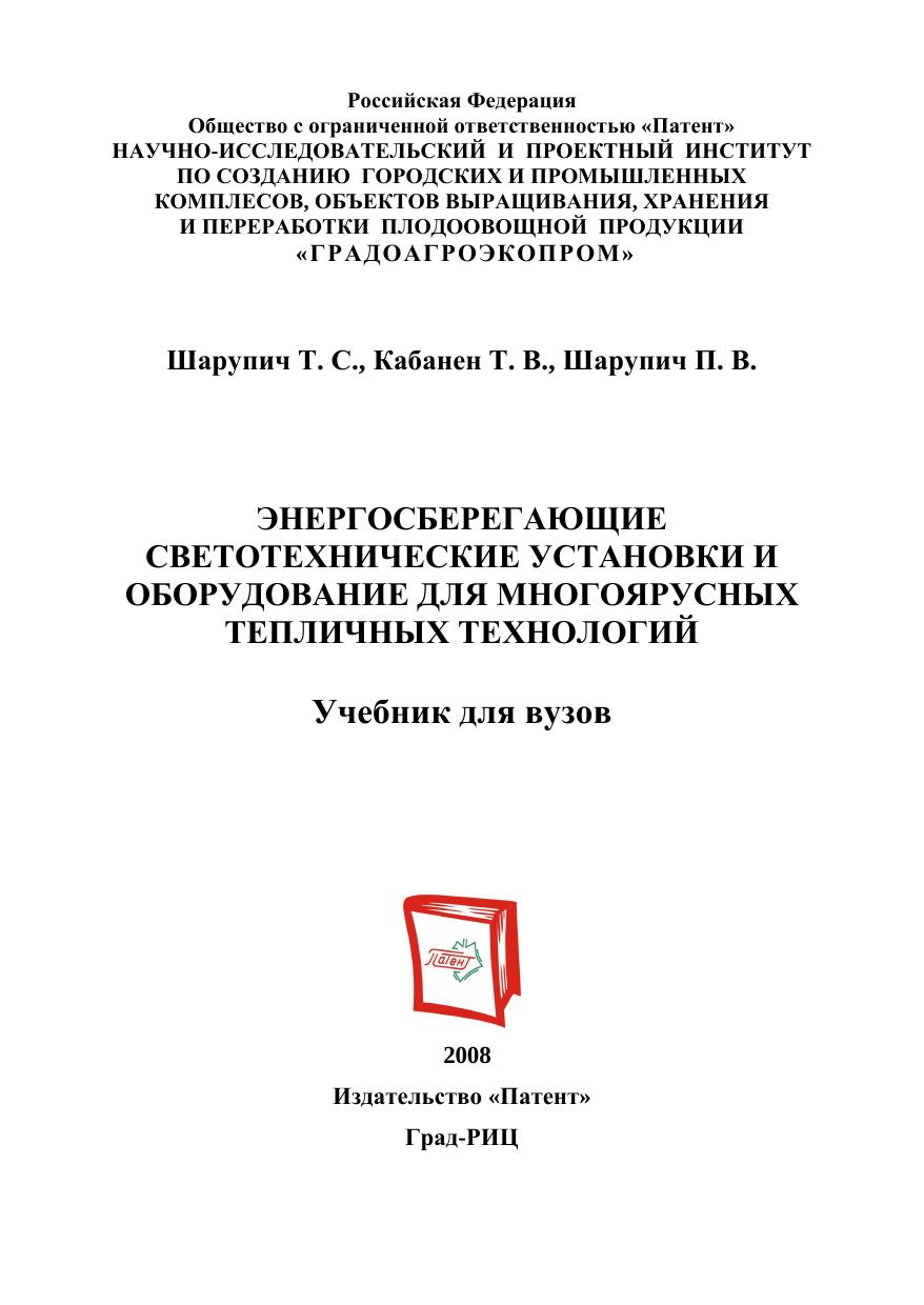 Учебник предназначен для специалистов, преподавателей, аспирантов,студентов отраслей защищенного грунта, электротехники, светотехники, экономики, занимающихся исследованиями, проектированием, изготовлением и строительством теплиц с интенсивными энергосберегающим и технологиям. и