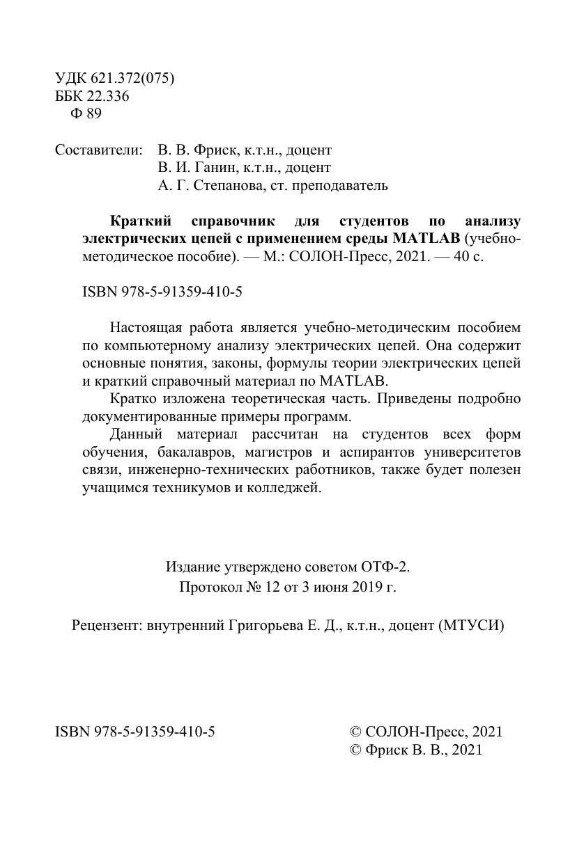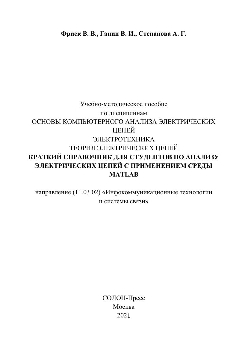 Настоящая работа является учебно-методическим пособием по компьютерному анализу электрических цепей. Она содержит основные понятия, законы, формулы теории электрических цепей и краткий справочный материал по MATLAB.