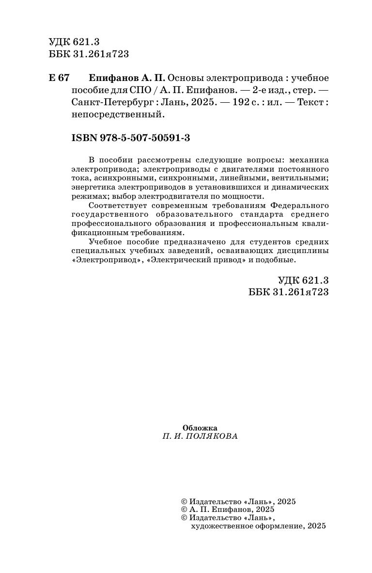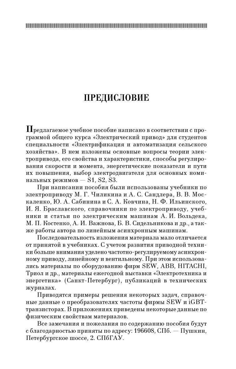 В пособии рассмотрены следующие вопросы: механика электропривода, электроприводы с двигателями постоянного тока, асинхронными, синхронными, линейными, вентильными, энергетика электроприводов в установившихся и динамических режимах, выбор электродвигателя по мощности. Соответствует современным требованиям Федерального государственного образовательного стандарта среднего профессионального образования и профессиональным квалификационным требованиям. Учебное пособие предназначено для студентов средних специаль-ных учебных заведений, осваивающих дисциплины «Электропривод», «Электрический привод» и подобные.