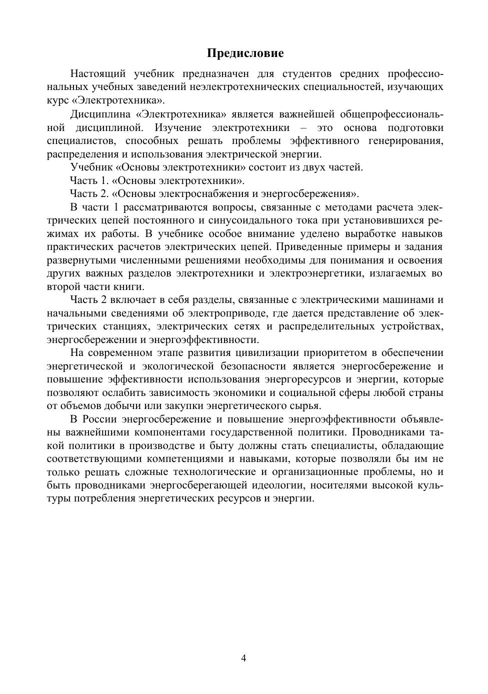 В учебнике изложены основные теоретические положения, включающие принципы и методы расчетов электрических цепей постоянного, однофазного и трехфазного токов. В книге приведены примеры и задачи с развернутыми численными решениями с целью выработки навыков практических расчетов электрических цепей, необходимых для понимания и изучения проблем эффективного генерирования, распределения и использования электрической энергии. Соответствует современным требованиям Федерального государственного образовательного стандарта среднего профессионального образования и профессиональным квалификационным требованиям. Учебник предназначен для студентов, обучающихся по специальностям среднего профессионального образования, при изучении электротехники.