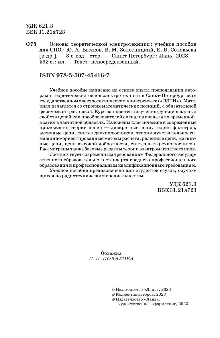 Учебное пособие написано на основе опыта преподавания авторами теоретических основ электротехники в Санкт-Петербургском государственном электротехническом университете («ЛЭТИ»). Материал излагается со строгих математических позиций, с обязательной физической трактовкой. Курс начинается с изучения функциональных свойств цепей как преобразователей сигналов сначала во временной, а затем в частотной областях. Изложены классические и современные приложения теории цепей — дискретные цепи, теория фильтров, активные цепи, синтез двухполюсников, теория чувствительности, машинно-ориентированные методы расчета, релейные цепи, магнитные цепи, цепи высокой добротности, синтез четырехполюсников. Рассмотрены также базовые разделы теории электромагнитного поля. Соответствует современным требованиям Федерального государственного образовательного стандарта среднего профессионального образования и профессиональным квалификационным требованиям. Учебное пособие предназначено для студентов ссузов, обучающихся по радиотехническим специальностям.