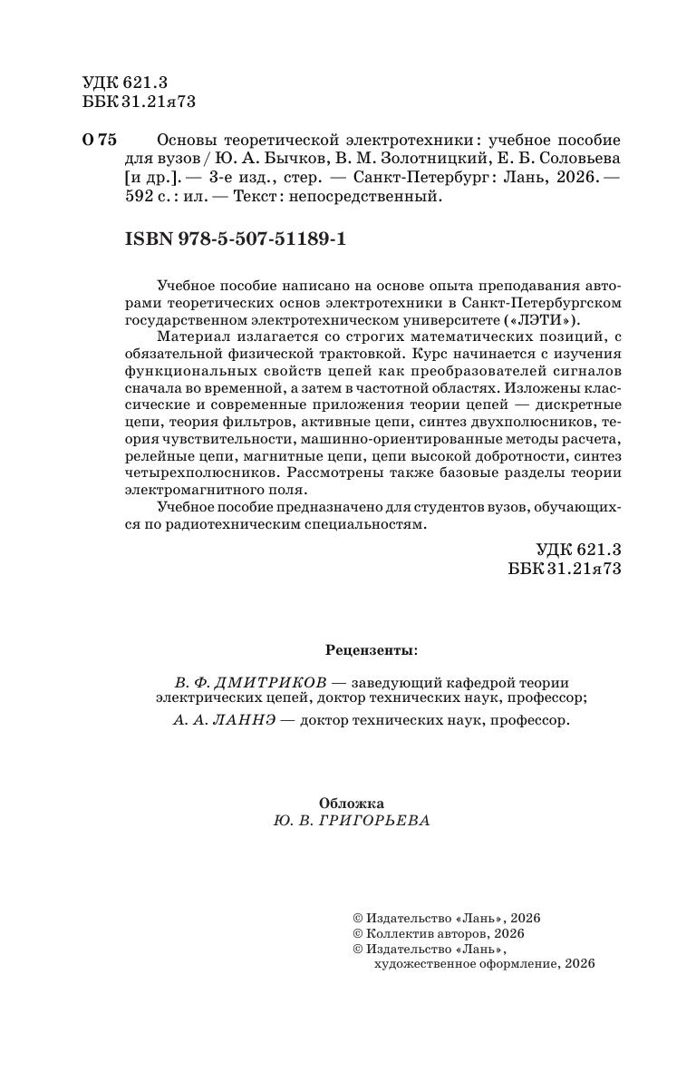 Учебное пособие написано на основе опыта преподавания авторами теоретических основ электротехники в Санкт-Петербургском государственном электротехническом университете ("ЛЭТИ"). Материал излагается со строгих математических позиций, с обязательной физической трактовкой. Курс начинается с изучения функциональных свойств цепей как преобразователей сигналов сначала во временной, а затем в частотной областях. Изложены классические и современные приложения теории цепей - дискретные цепи, теория фильтров, активные цепи, синтез двухполюсников, теория чувствительности, машинно-ориентированные методы расчета, релейные цепи, магнитные цепи, цепи высокой добротности, синтез четырехполюсников. Рассмотрены также базовые разделы теории электромагнитного поля. Учебное пособие предназначено для студентов вузов, обучающихся по радиотехническим специальностям.