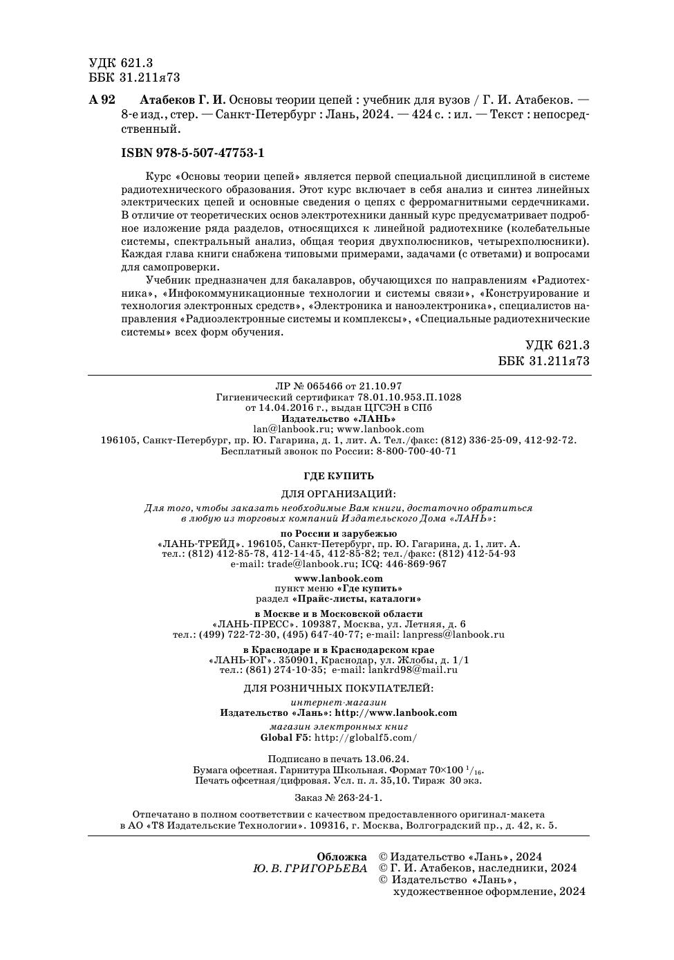Курс «Основы теории цепей» является первой специальной дисциплиной в системе радиотехнического образования. Этот курс включает в себя анализ и синтез линейных электрических цепей и основные сведения о цепях с ферромагнитными сердечниками. В отличие от теоретических основ электротехники данный курс предусматривает подробное изложение ряда разделов, относящихся к линейной радиотехнике (колебательные системы, спектральный анализ, общая теория двухполюсников, четырехполюсники). Каждая глава книги снабжена типовыми примерами, задачами (с ответами) и вопросами для самопроверки. Учебник предназначен для бакалавров, обучающихся по направлениям "Радиотехника", "Инфокоммуникационные технологии и системы связи", "Конструирование и технология электронных средств", "Электроника и наноэлектроника", специалистов направления "Радиоэлектронные системы и комплексы", "Специальные радиотехнические системы" всех форм обучения.