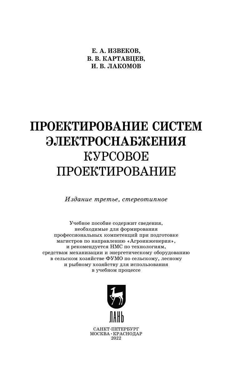 Учебное пособие содержит основные теоретические положения, порядок расчета и пример выполнения курсового проекта по дисциплине «Проектирование систем электроснабжения». Учебное пособие предназначено для студентов высших учебных заведений, обучающихся по направлению подготовки магистратуры «Агроинженерия» очной и заочной форм обучения. Может быть полезно специалистам организаций, занимающихся проектированием систем электроснабжения.