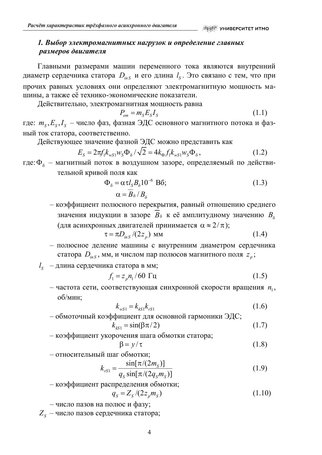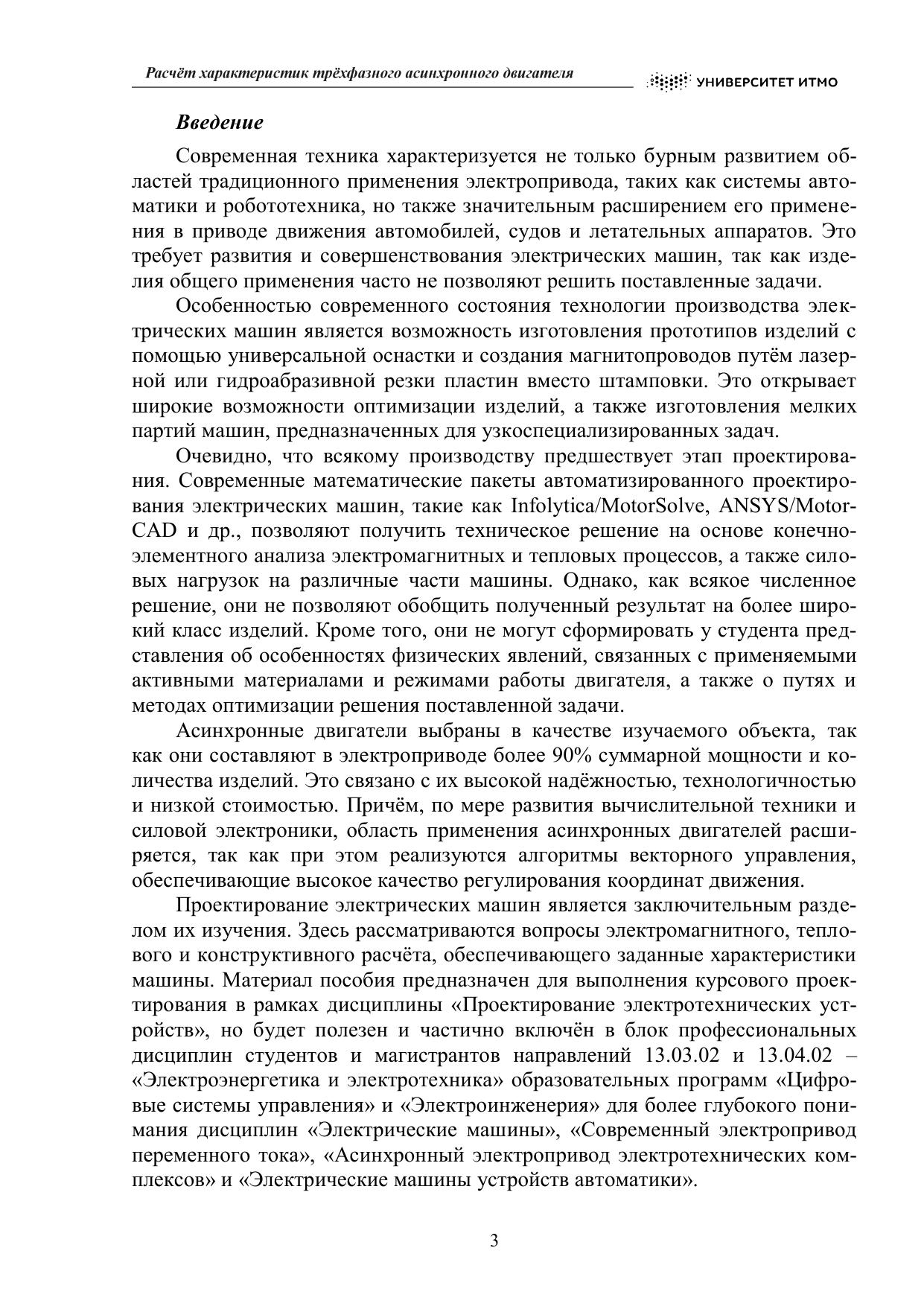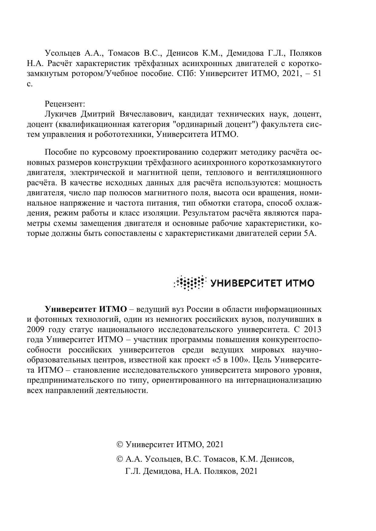 Пособие по курсовому проектированию содержит методику расчёта основных размеров конструкции трёхфазного асинхронного короткозамкнутого двигателя, электрической и магнитной цепи, теплового и вентиляционного расчёта. В качестве исходных данных для расчёта используются: мощность двигателя, число пар полюсов магнитного поля, высота оси вращения, номинальное напряжение и частота питания, тип обмотки статора, способ охлаждения, режим работы и класс изоляции. Результатом расчёта являются параметры схемы замещения двигателя и основные рабочие характеристики, которые должны быть сопоставлены с характеристиками двигателей серии 5А.