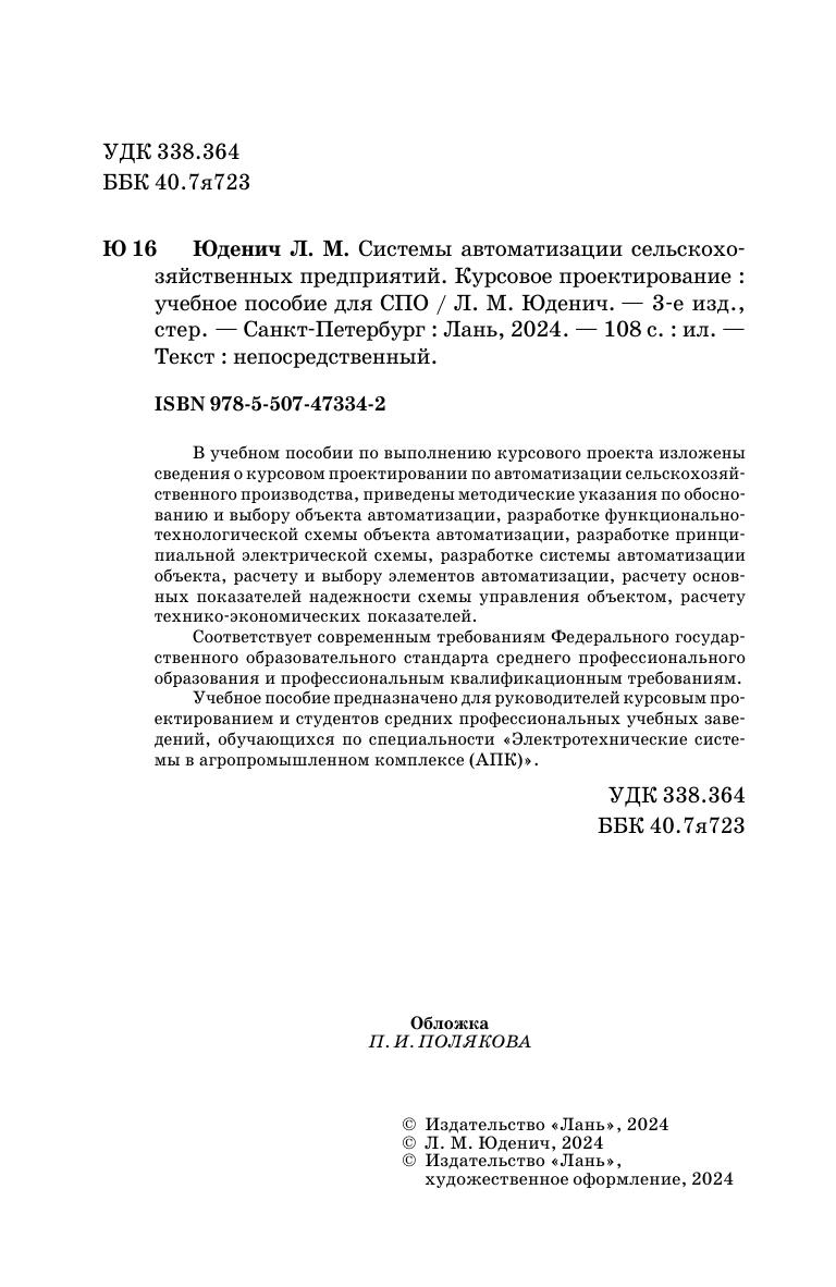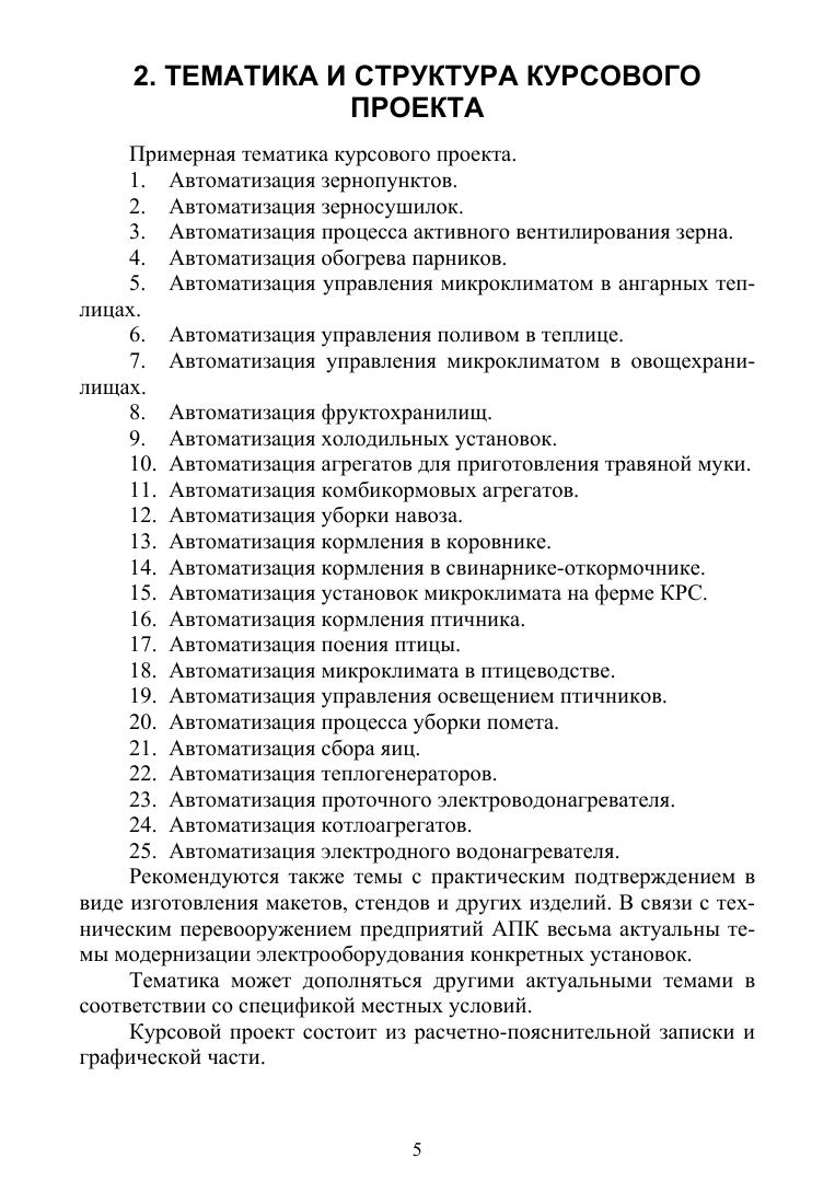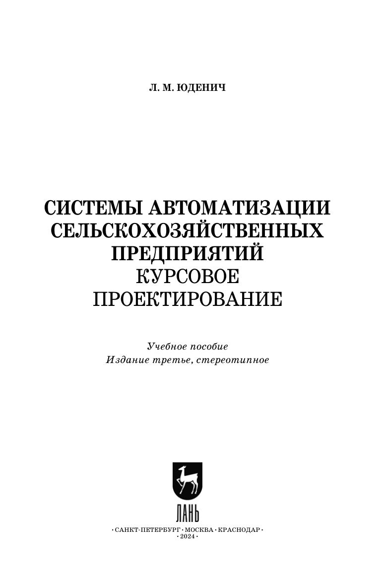 В учебном пособии по выполнению курсового проекта изложены сведения о курсовом проектировании по автоматизации сельскохозяйственного производства, приведены методические указания по обоснованию и выбору объекта автоматизации, разработке функционально-технологической схемы объекта автоматизации, разработке принципиальной электрической схемы, разработке системы автоматизации объекта, расчету и выбору элементов автоматизации, расчету основных показателей надежности схемы управления объектом, расчету технико-экономических показателей. Соответствует современным требованиям Федерального государственного образовательного стандарта среднего профессионального образования и профессиональным квалификационным требованиям. Учебное пособие предназначено для руководителей курсовым проектированием и студентов средних профессиональных учебных заведений, обучающихся по специальности «Электротехнические системы в агропромышленном комплексе (АПК)».