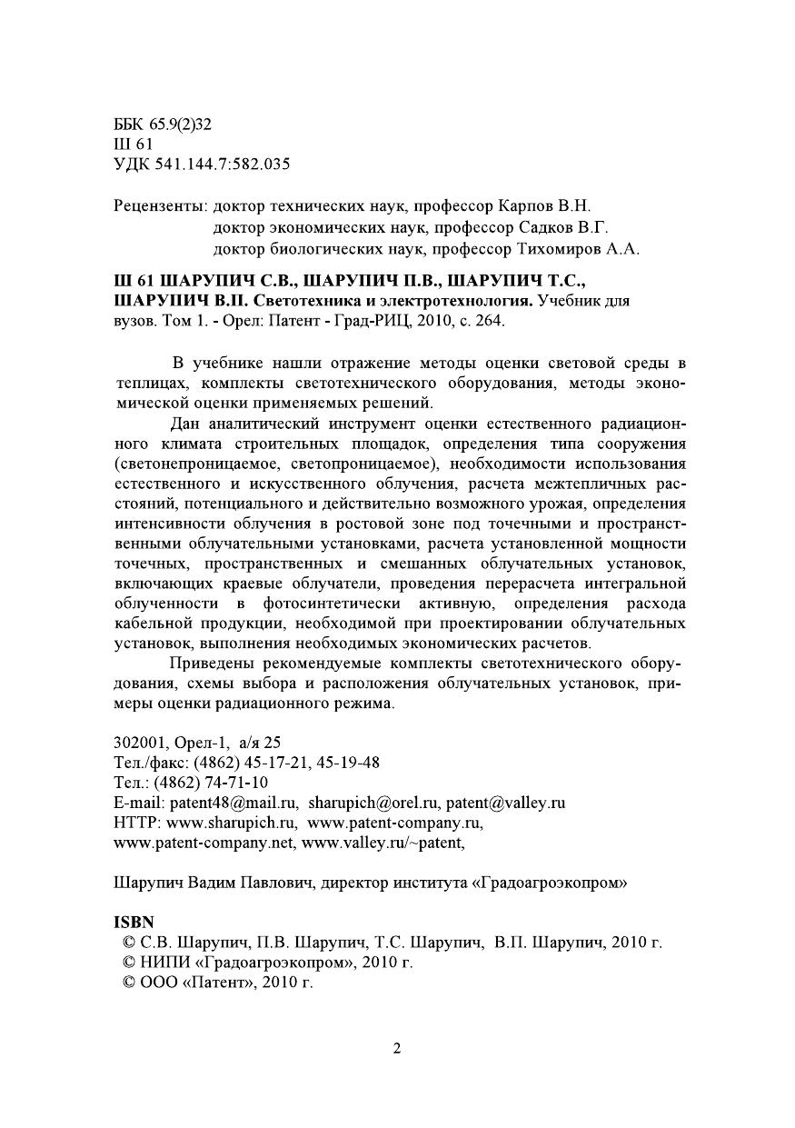 В учебнике нашли отражение методы оценки световой среды в теплицах, комплекты светотехнического оборудования, методы экономической оценки применяемых решений.